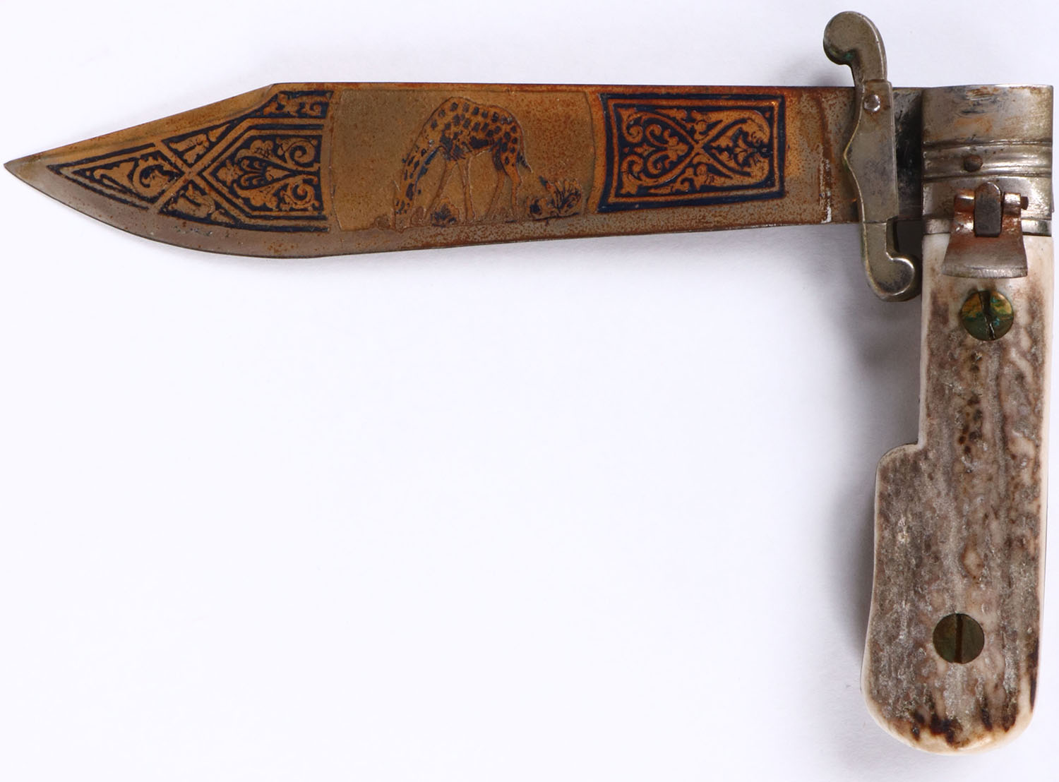 Folding knife with intricate design to blade'', 5'' blade, stag handle, blade has as quick release button, blade and handle have some age soiling. Grade: Very Good - Value: 20 to 100