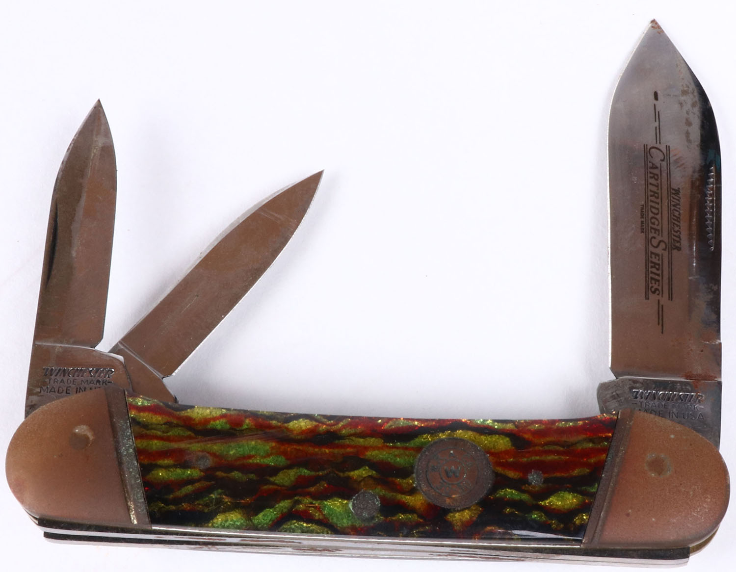 Winchester folding knife, 3 blades, Cartridge Series, 2 3/4'' longest blade, blade and handles have rust. Grade: Good ++ - Value: 10 to 100