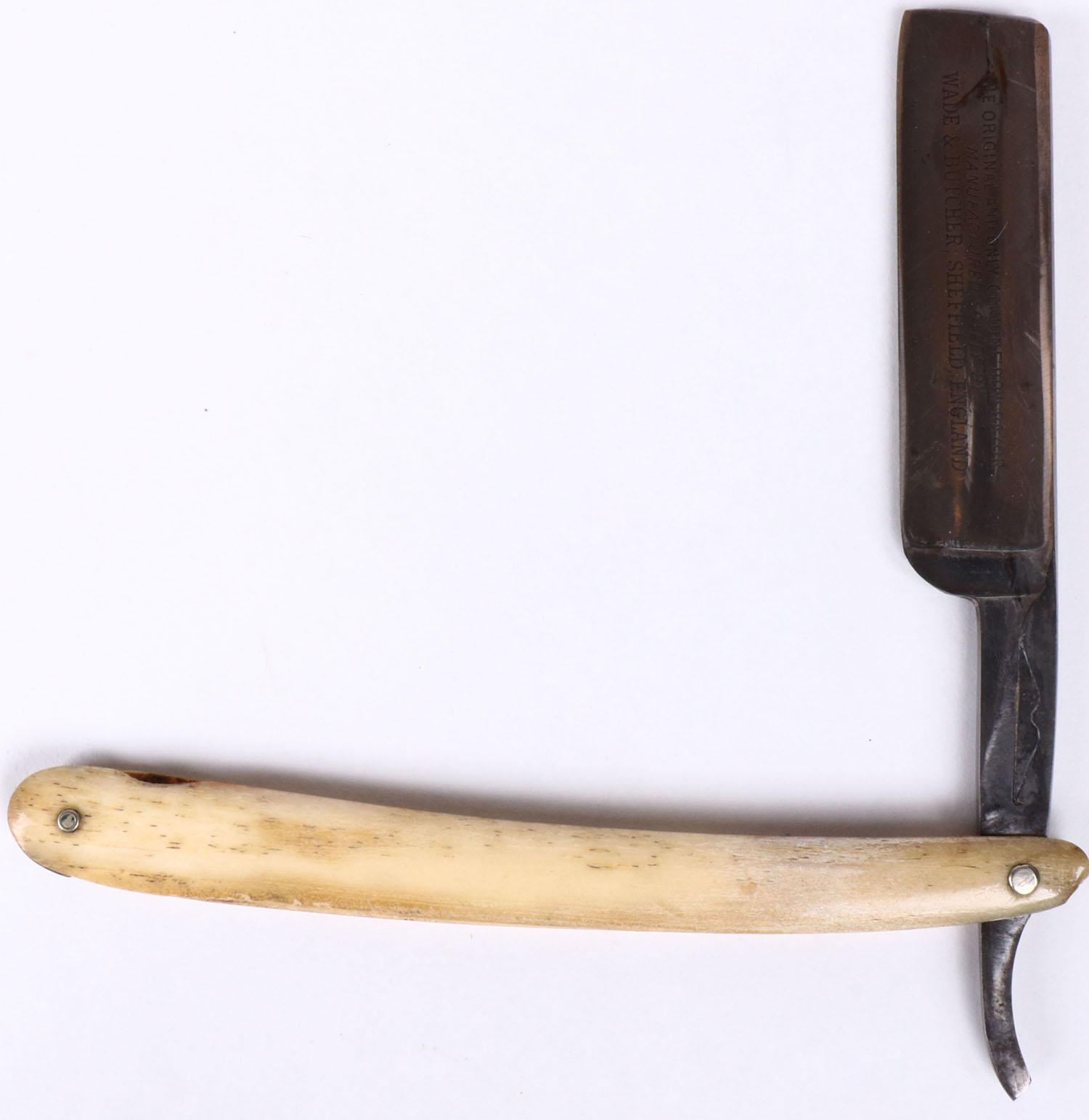 RARE! Ivory Handle Sheffield Straight Razor with engraved blade ''The original & only genuine Bow razor MFG. solely by Wade & Butcher Sheffield, England''. Grade: Excellent - Value: 20 to 100