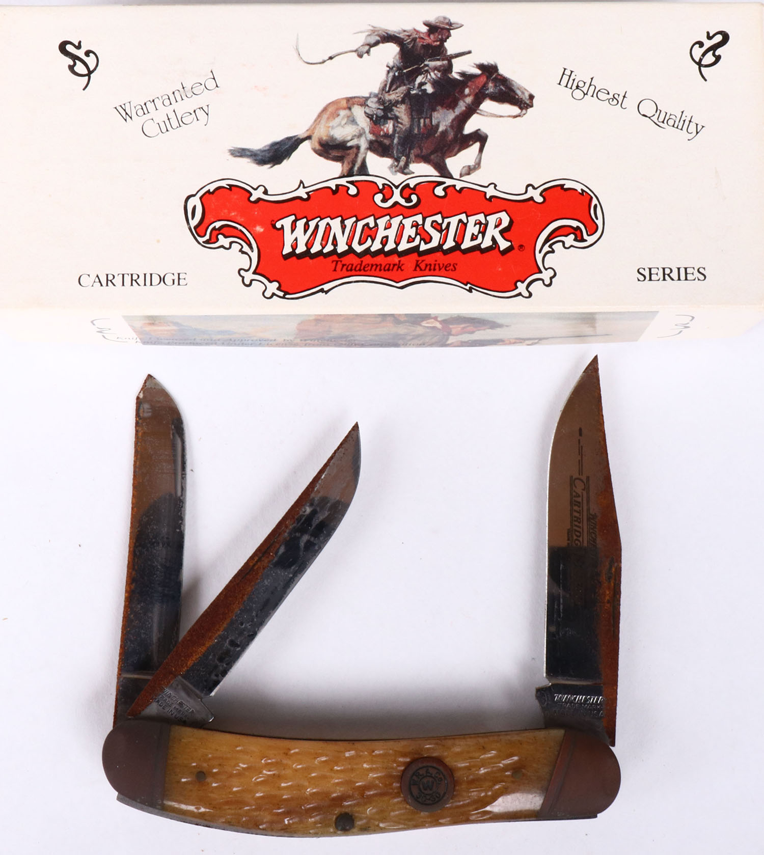 Winchester folding knife, in orignal box, No. W 18 39049 T Tan Bone 30-30 Shield, knife has a lot of rust. Grade: Good ++ - Value: 6 to 60