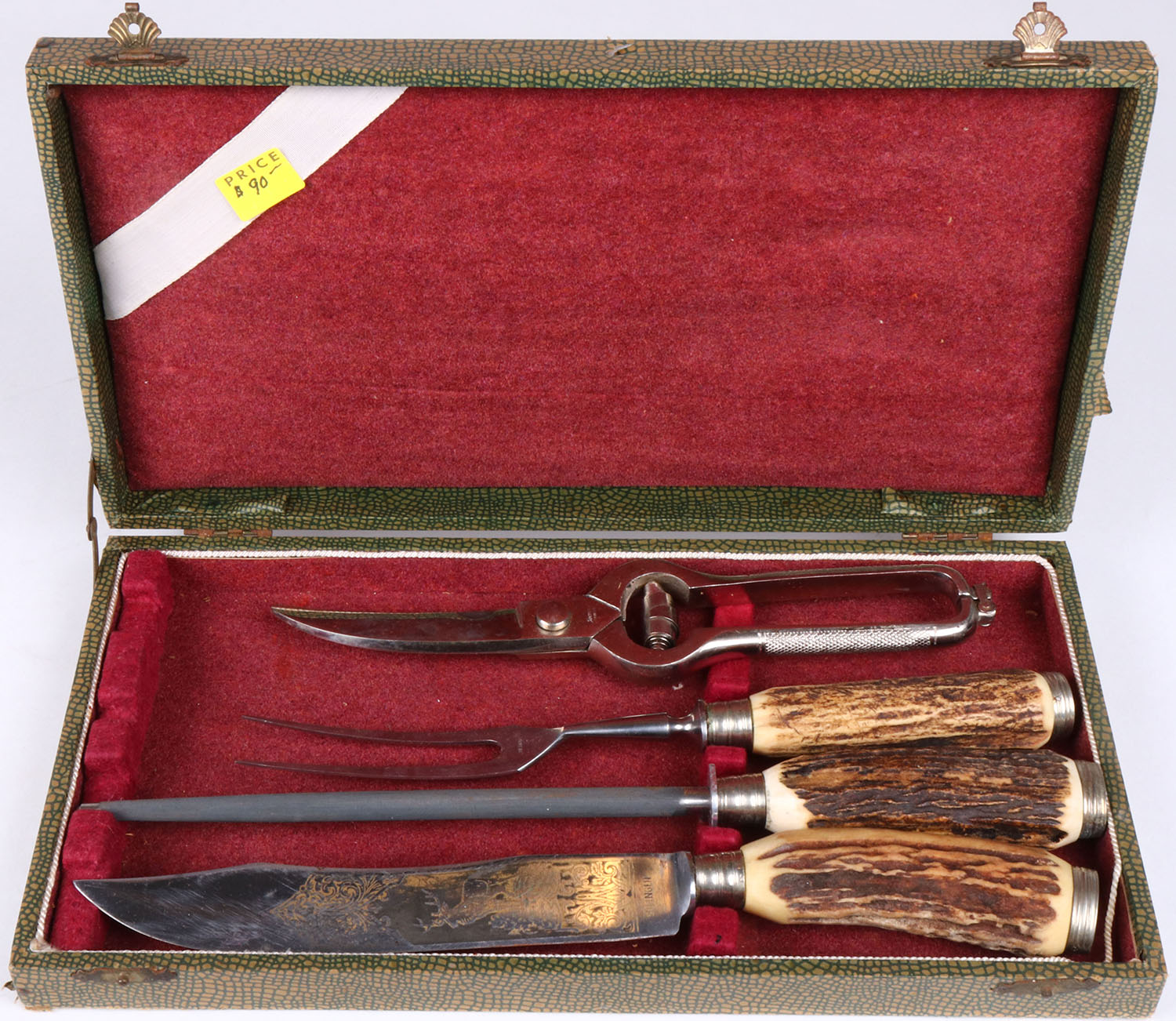 Knife set, 1 blade intricately marked, in a beautiful case, all stag handles, some have age soiling. Grade: Excellent - Value: 30 to 100