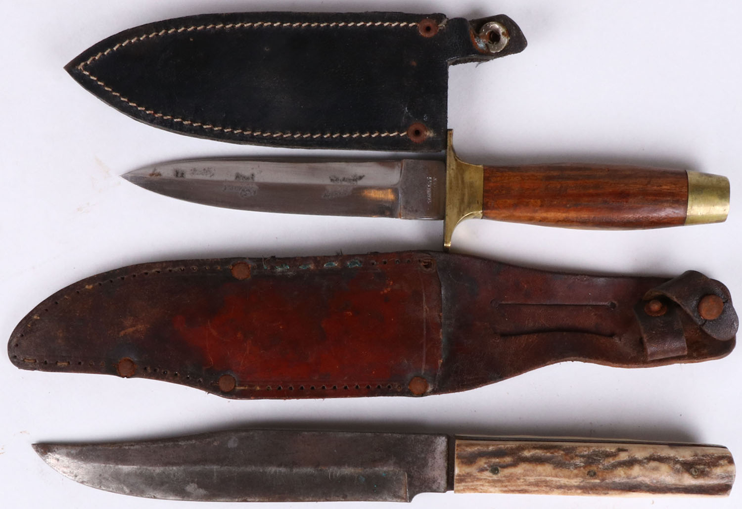 Lot of 2 Unmarked fixed blade knife, stag handle, leather sheath, 6'' blade, age soiling. Grade: Very Good - Value: 10 to 50