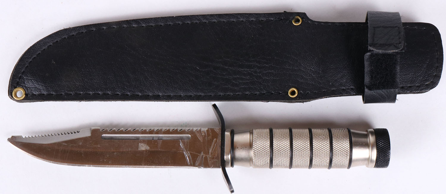 Fixed blade knife, in leather sheath, has tape and damage to tip. Grade: Very Good - Value: 6 to 60