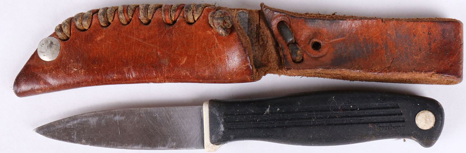 Unmarked fixed blade knife, in leather sheath. Grade: Very Good - Value: 6 to 60