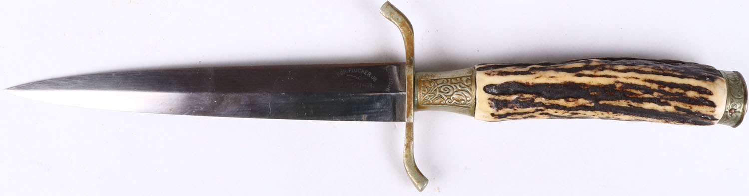Frieder Plucker jr. fixed blade knife, stag handle, brass hilt, 6'' blade. Grade: Excellent - Value: 10 to 60