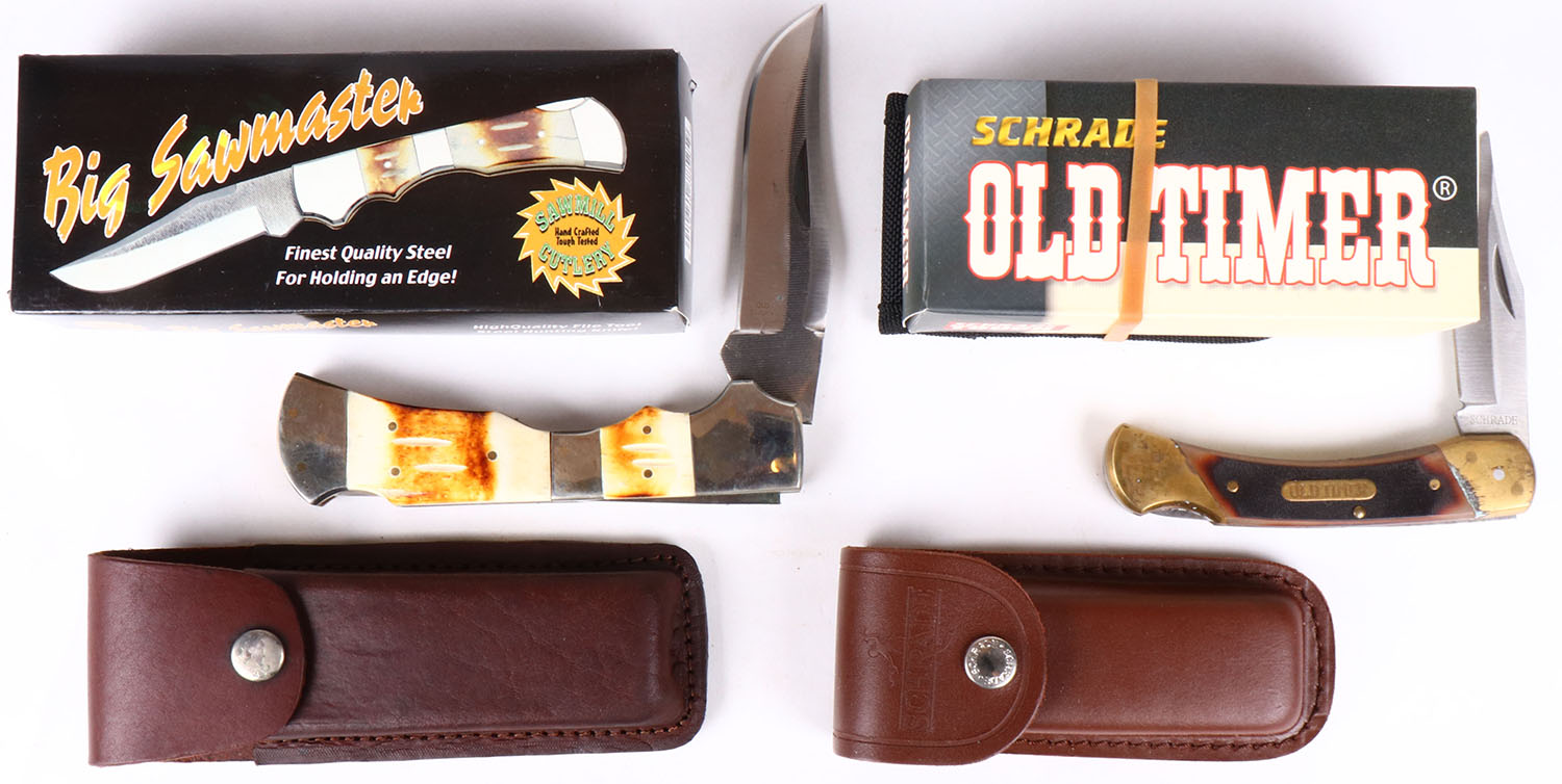Lot of 2 folding knives, in orignal box, all bright and clean. Grade: MINT - Value: 10 to 100