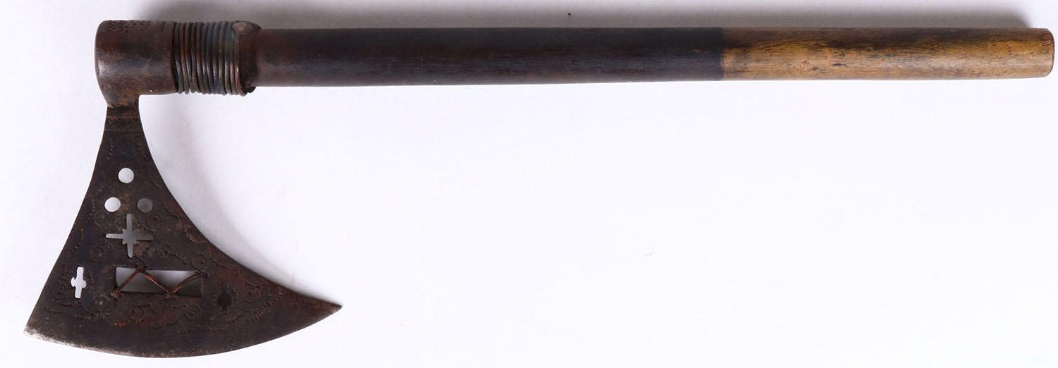 Handmade hatchet, wood handle, 15'' OAL, has age soiling. Grade: Very Good - Value: 10 to 50