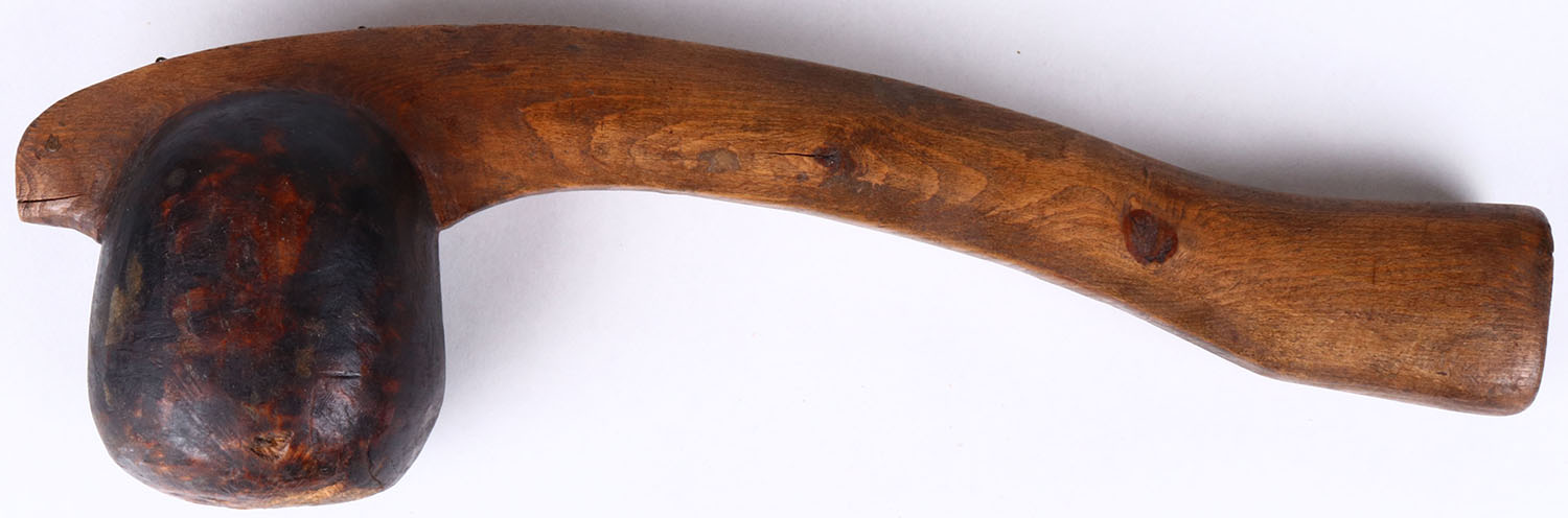 Handmade club, wood handle, 16'' OAL, has age soiling. Grade: Very Good - Value: 10 to 100
