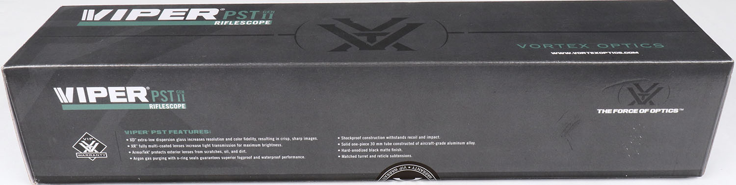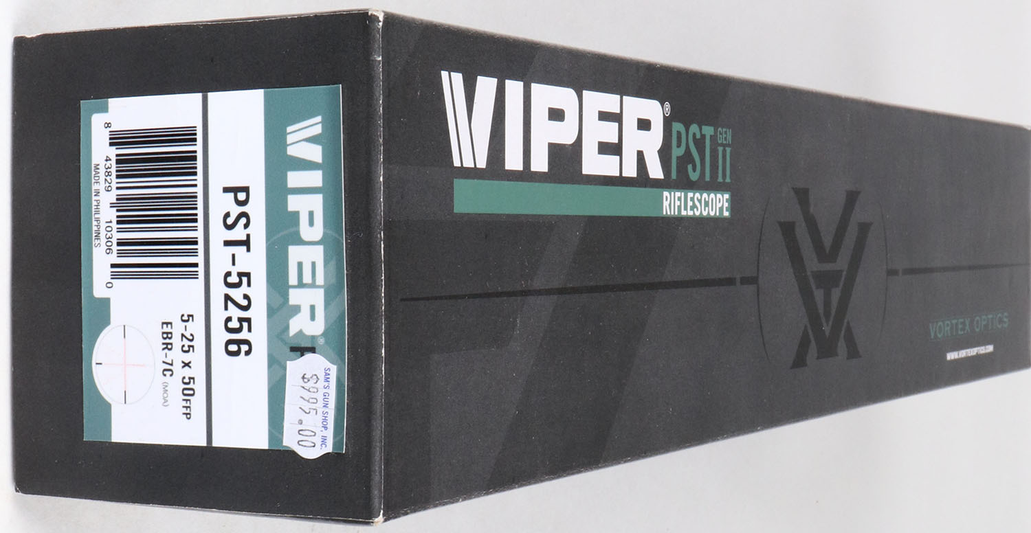 Vortex, Viper PST Gen II, 5-25 x 50mm, Variable Magnification Rifle Scope, SEALED NIB, 30mm Tube Diameter, First Focal Plane EBR-7C (MOA) Illuminated Reticle, Adjustable Parallax from 20 Yards to Infinity, Fast Focus Eyepiece, Nitrogen Gas Purged Housing, Waterproof, Fogproof, Shock Proof, 3.5 Inches of eye relief, 16 Inches long, weighs 31.2 Ounces, Medium Height exposed turrets have 75 MOA of internal adjustment for elevation and 35 MOA for windage, 1/4 MOA Clicks, Fully Multi-Coated XD Glass, comes with RZR Zero Stop, Sun Shade, cleaning cloth, CR2032 Battery, and the unmatched Vortex VIP Unconditional Warranty. Grade: MINT - Value: 500 to 1500