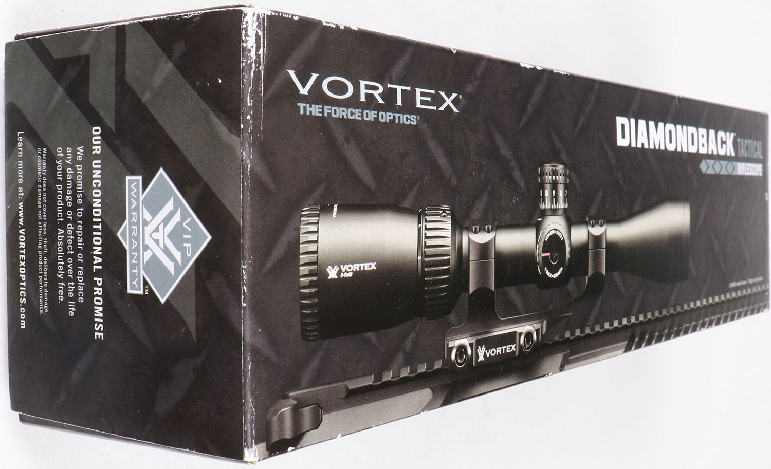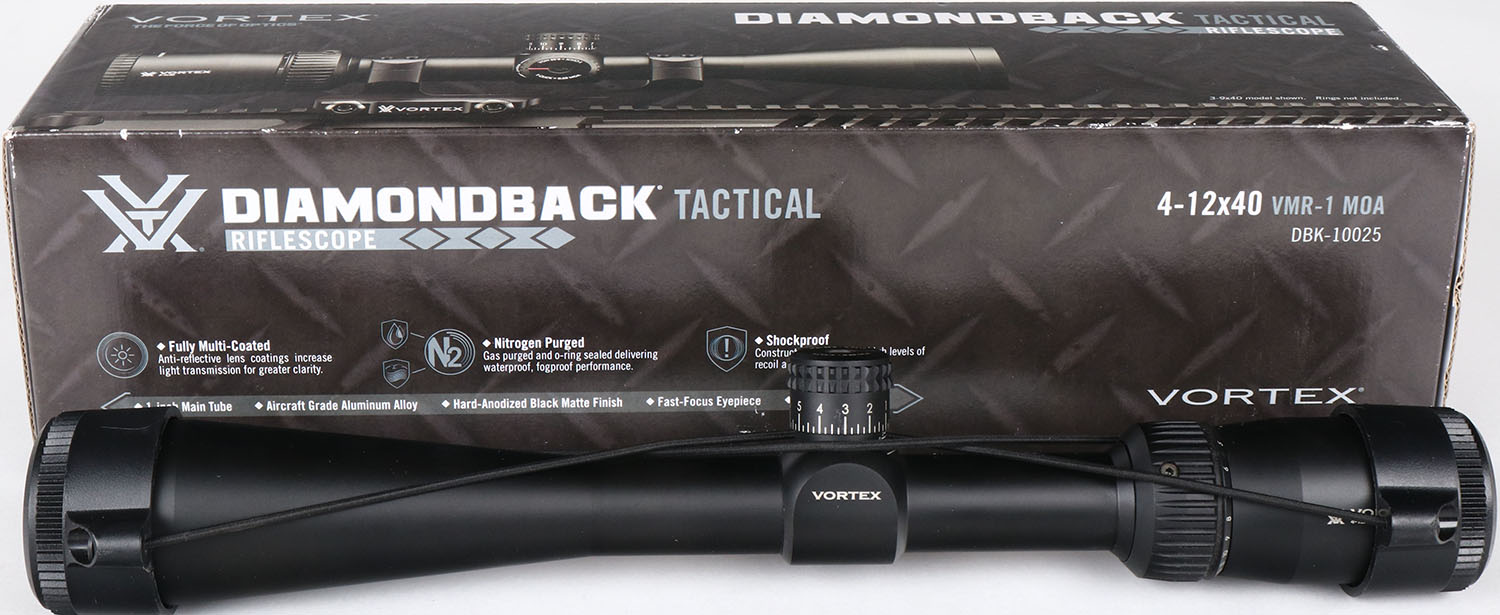 Vortex, Diamondback Tactical, 4-12 x 40mm, Variable Magnification Rifle Scope, Like New, 1 Inch Tube Diameter, VMR-1 MOA Reticle, Second Focal Plane, Matte Black Finish, Waterproof, Fogproof, Shockproof, Parallax is fixed at 100 yards, Scope is 14 Inches Overall and weighs in at 16.2 Ounces, Fast Focus Eye Piece has 3.8 Inches of eye relief, High Turrets are exposed and have 70 MOA of internal adjustment, Clicks are very positive and audible, Fully Multi-Coated lenses are like new with beautiful clarity, comes with tethered lens caps, cleaning cloth, and the Vortex Unconditional Lifetime warranty. Grade: Excellent ++ - Value: 200 to 400