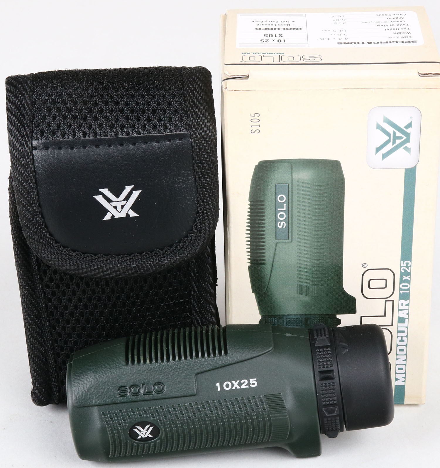 Vortex, Solo, 10 x 25mm Monocular, NIB, Comes with carrying case, neck strap, utility clip and rain guard, 10x magnification, 14.5 mm of eye relief, Field of view at 1000 yards is 315 feet, Fully multi-coated lenses, waterproof, 4 1/2'' long and weighs just 5.6 ounces, comes with the unbeatable Vortex VIP Unconditional lifetime warranty. Grade MINT - Value: 80 to 160