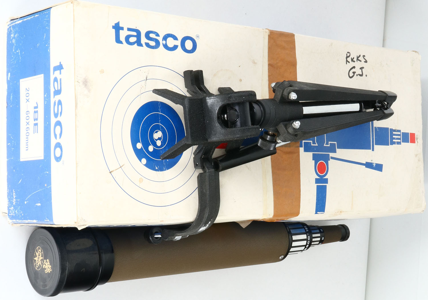 Tasco 18E spotting scope, 20x-60x60mm, in orignal case. Grade: Very Good + - Value: 20 to 200