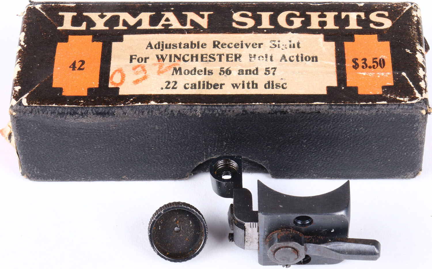 Lyman Tang sight for Win Mod 56 & 57, in orignal box with aperture disk & diection sheet. Grade: Excellent - Value: 50 to 125