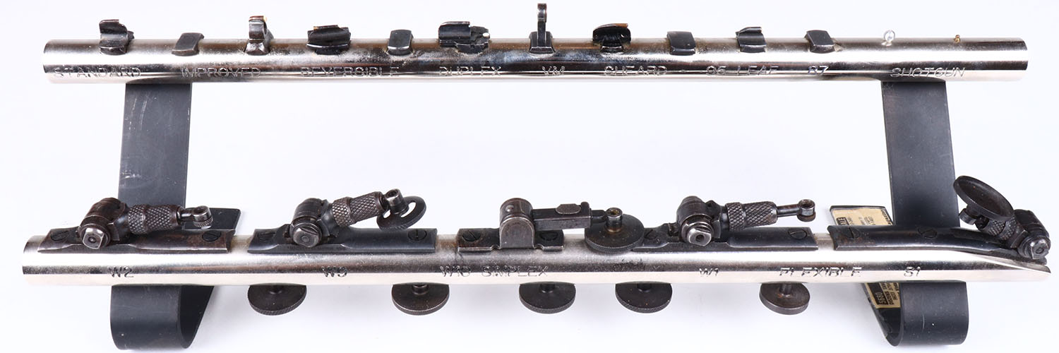 RARE! Marbles Sight Display Stand, featured in 1924 catalog, displayed has various tang sights, front sights & aperture discs., ID marked on rods. Grade: Excellent - Value: 1000 to 5000
