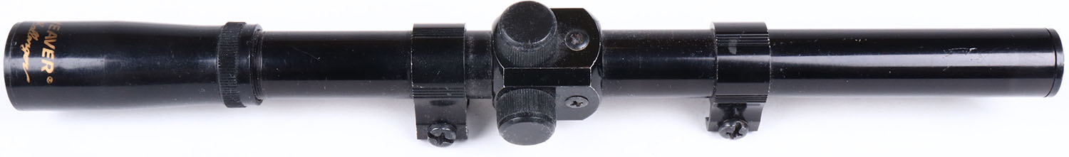 RARE! Weaver 3/4'' Rifle scope, Model Challenger, 4 power, fine crosshair reticle, 1 1/2'' eye relief, gold painted model design. Grad: Excellent - Value: 6 to 60