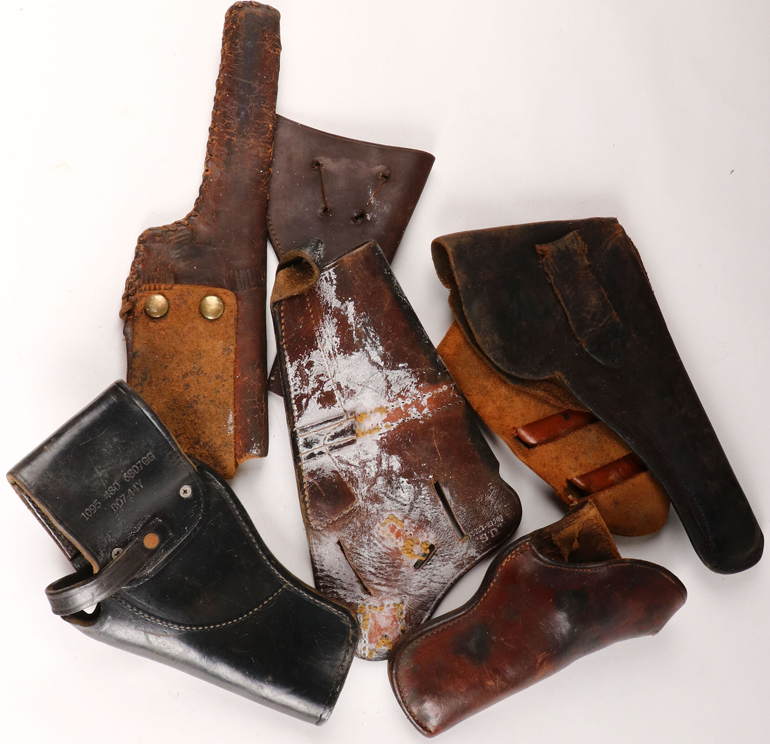 Large lot of leather pistol holsters. Grade: Very Good - Value: 10 to 100