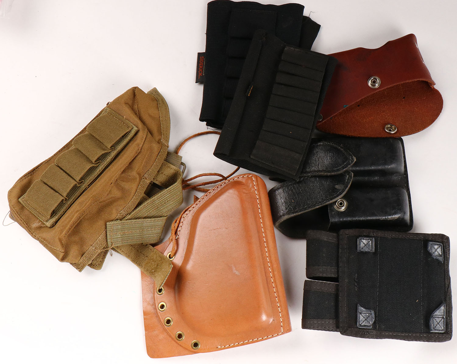 Large lot of leather pistol holsters and synthetic cart holster. Grade: Very Good - Value: 10 to 100