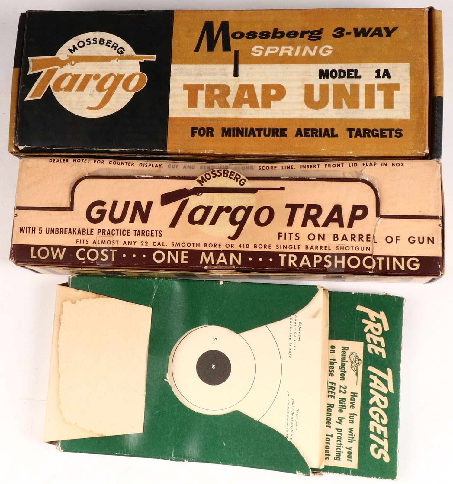 Lot of 3, 2 hand trap throwers, and paper targets, 1 box has clay targets in it with thrower, other box just has a thrower. Grade: Very Good ++ - Value: 10 to 100