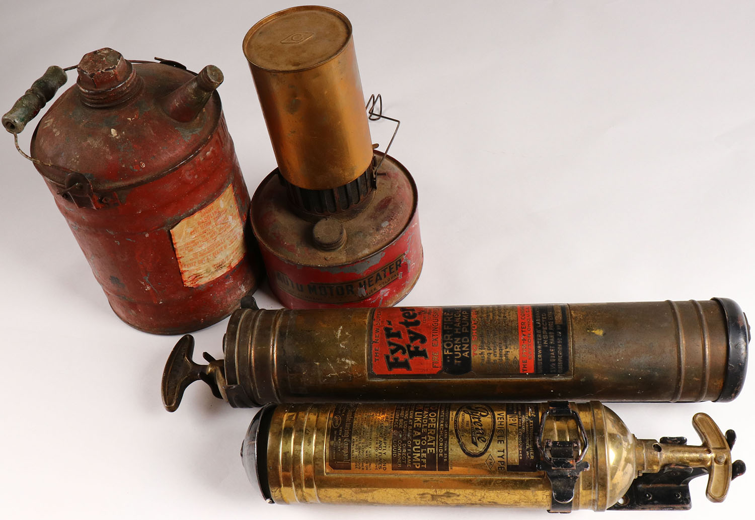 Lot of 4, 2 antique brass fire extinguishers, 1 gas can and a lamp. Grade: Very Good - Value: 10 to 100