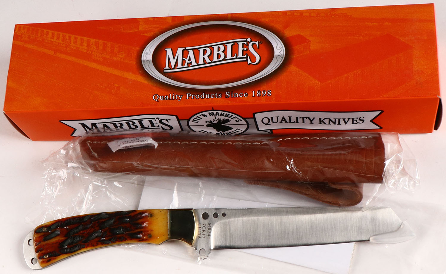 Marbles fixed blade knife in orignal box, with leather sheath, all bright and clean. Grade: Excellent ++ - Value: 20 to 200