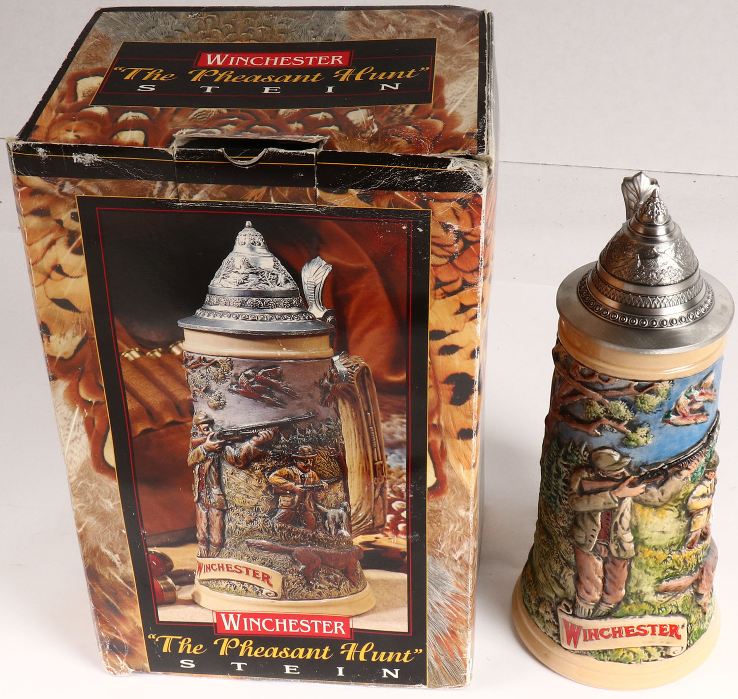 Winchester beer Stein, German made mug, The Pheasant Hunt, in orignal box, all solid and clean. Grade: Excellent ++ - Value: 100 to 300