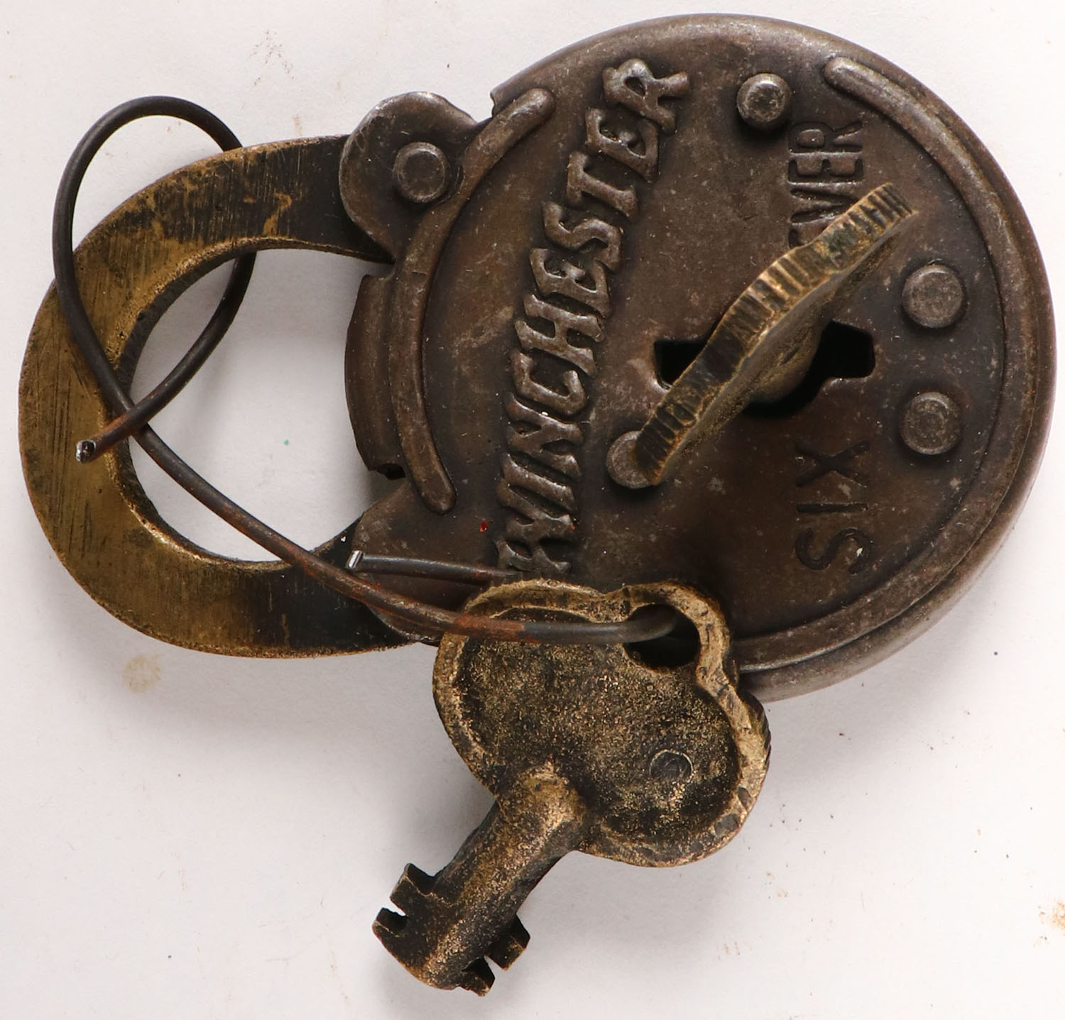 Small Winchester padlock, has key. Grade: Excellent - Value: 4 to 60