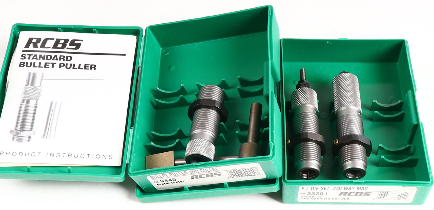 Lot of 2 RCBS reloading dies, .240 wby mag. And bullet puller without collet., in original box. Grade: Excellent - Value: 10 to 50
