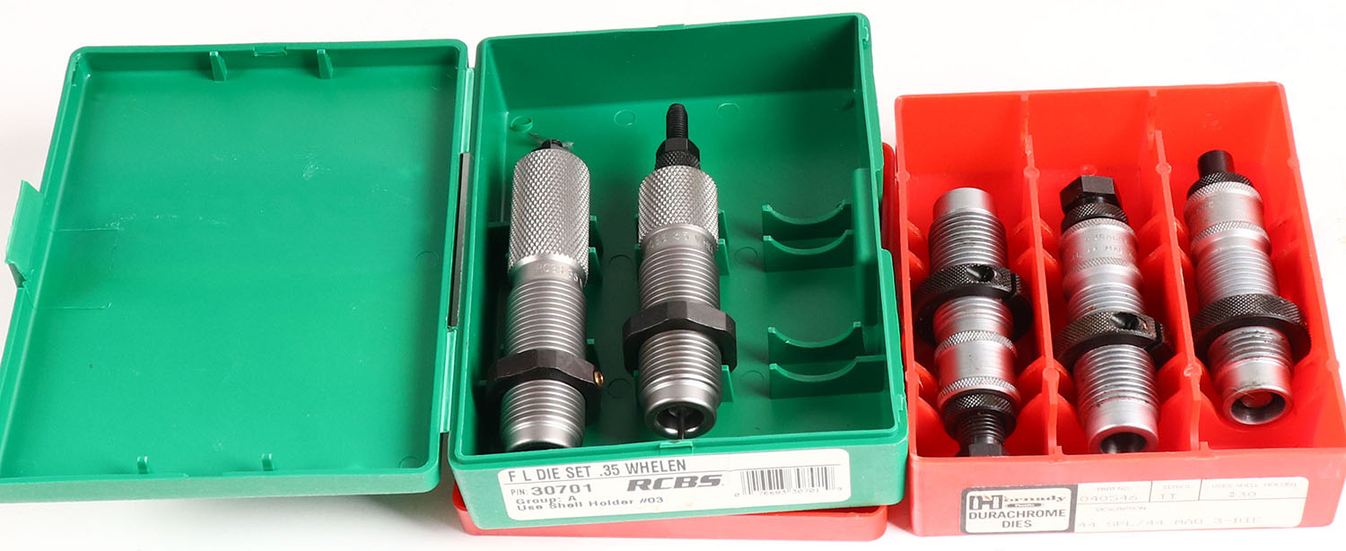 Lot of 2 RCBS and Hornady reloading dies, ..35 Whelen and .44 spl/44 mag, in original box. Grade: Excellent - Value: 16 to 60