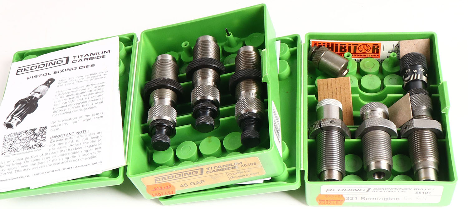 Lot of 2 Redding reloading dies, .45 GAP and .221 Rem, in original box. Grade: Excellent - Value: 16 to 60