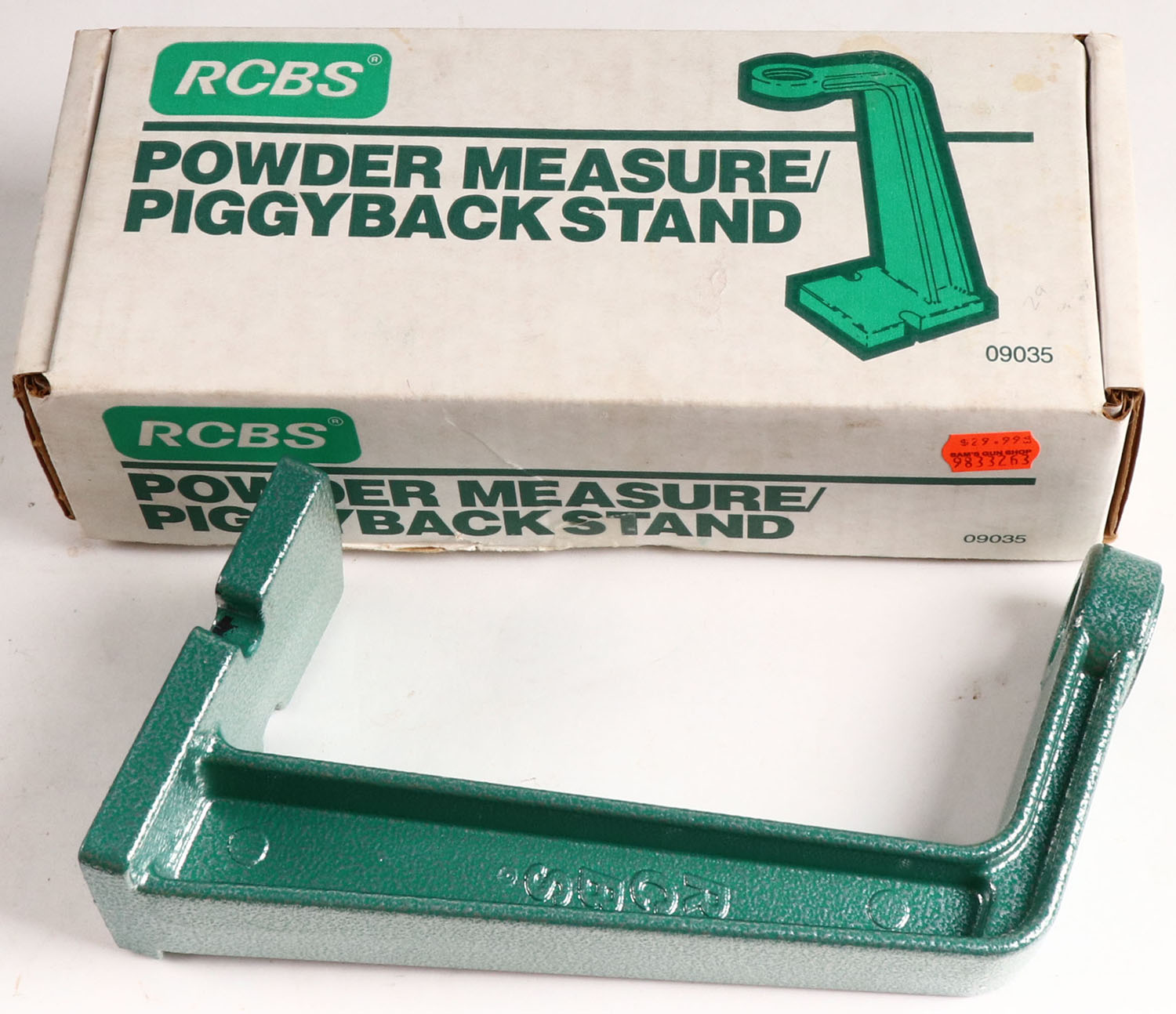 RCBS powder measurer piggy back stand, in orignal box. Has age soiling. Grade: Excellent - Value: 2 to 20