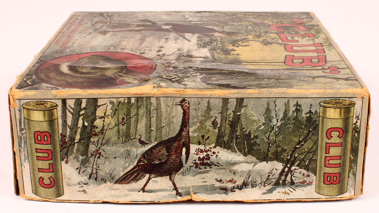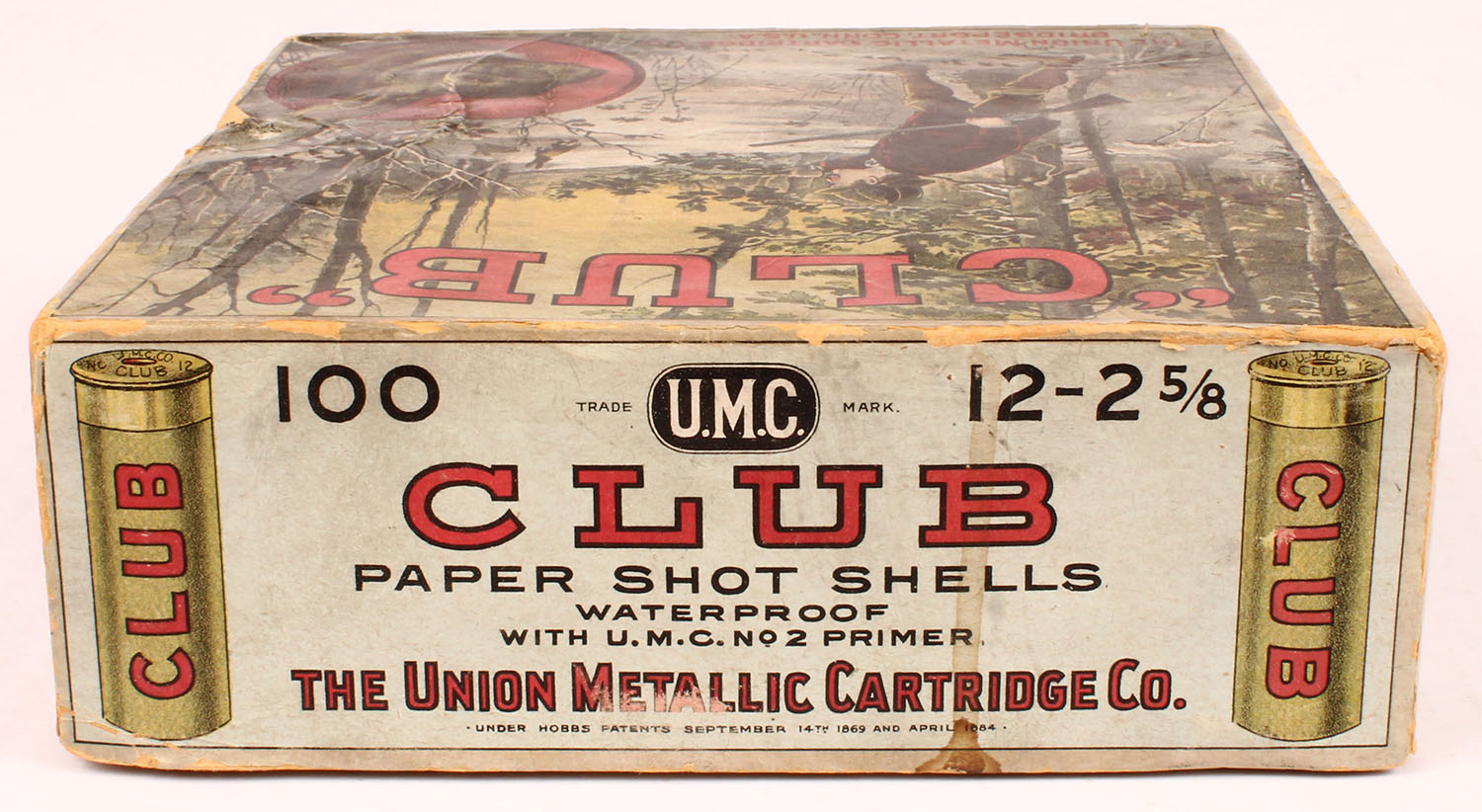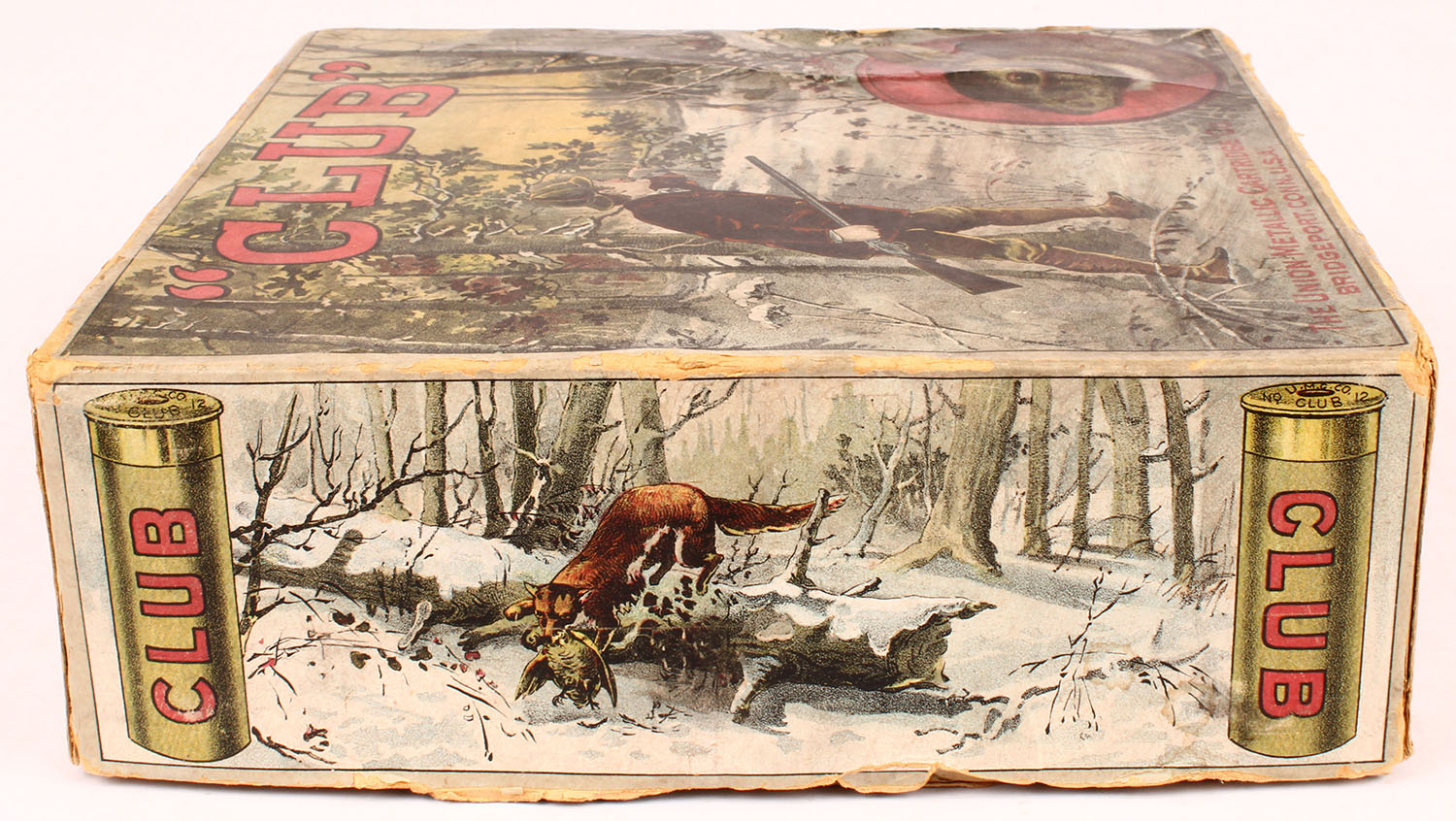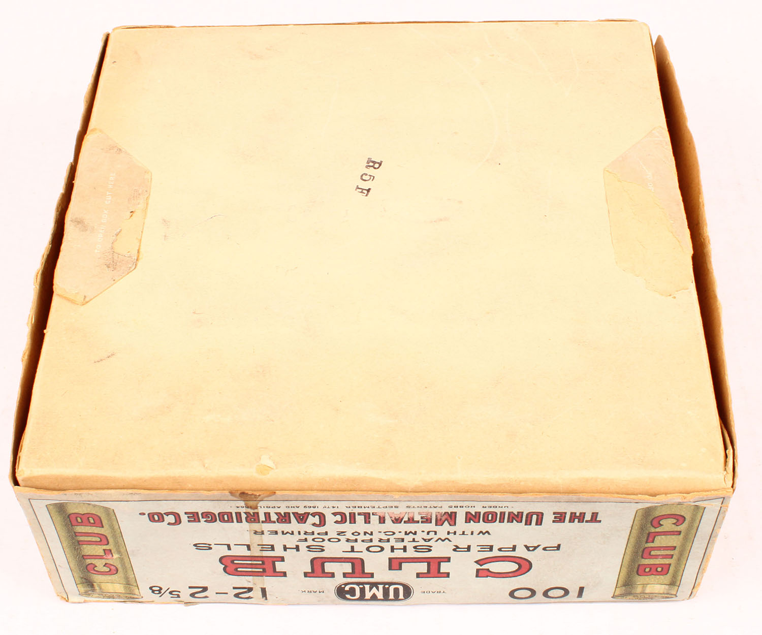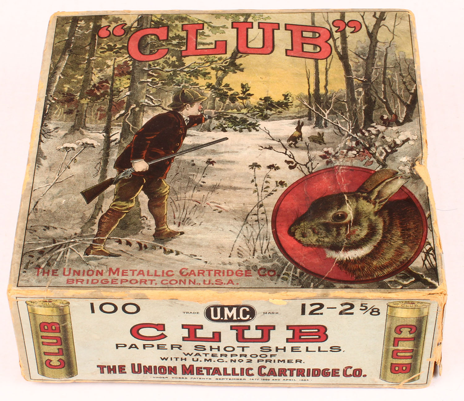 EXTREMELY RARE, U.M.C. CLUB 100ct. Christmas Box, 12ga, 2pc., Full, 2 5/8'', multi colored box with winter scene and hunter looking at two rabbits in the distance on top label, box has light soiling, light edge wear and seam split, Shells are excellent. Grade: Excellent ++ - Value: 10000 to 30000