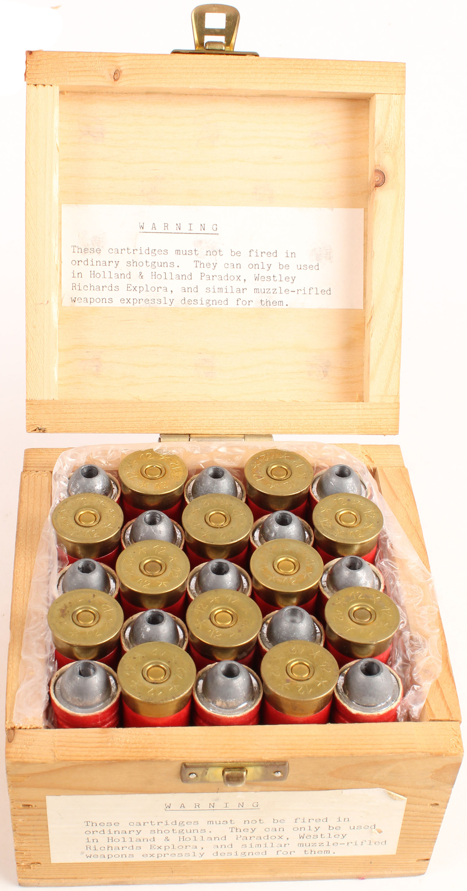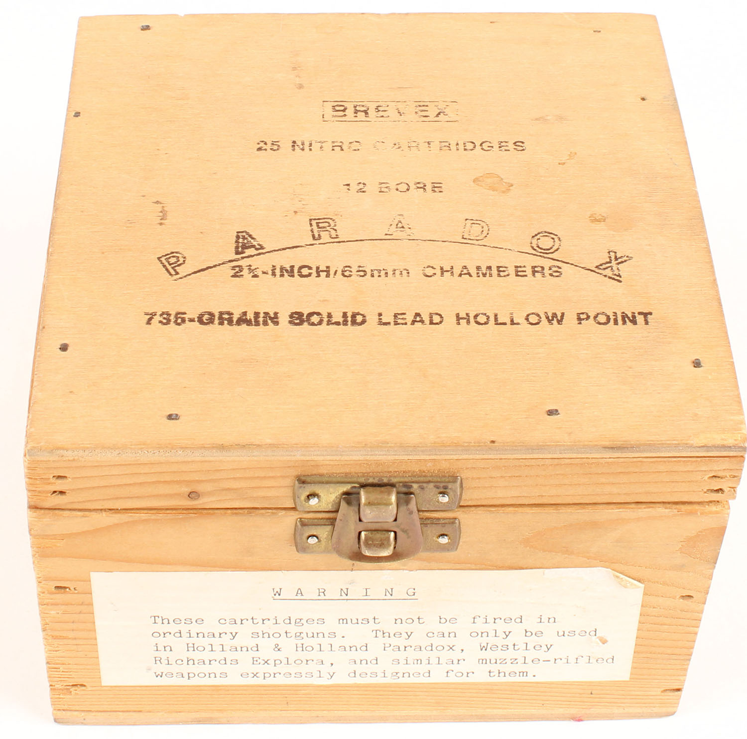 Brevex PARADOX, , 12 Bore, 1pc., Full, shot size 735 Grain Solid Lead Hollow Point, wood box with black text, Shells are excellent. Grade: Excellent + - Value: 50 to 400