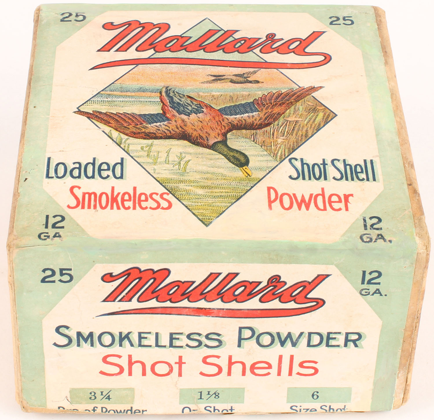 RARE! Clinton Cartridge Co., MALLARD, 12ga., 2pc., Empty, shot size 6 Shot, Loading 3 1/4 Drs. 1 1/8 oz. No. 6 Shot, buff box with multi colored label picturing a Mallard flying down, box has excellent colors with light age soiling & light scuffing, label is 100% ORIGINAL, VERY RARE BOX! * Grade: Excellent ++ - Value: 1500 to 4000