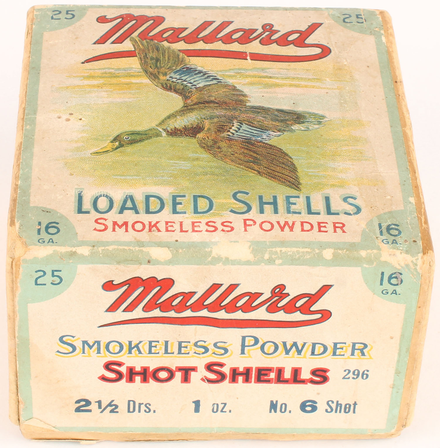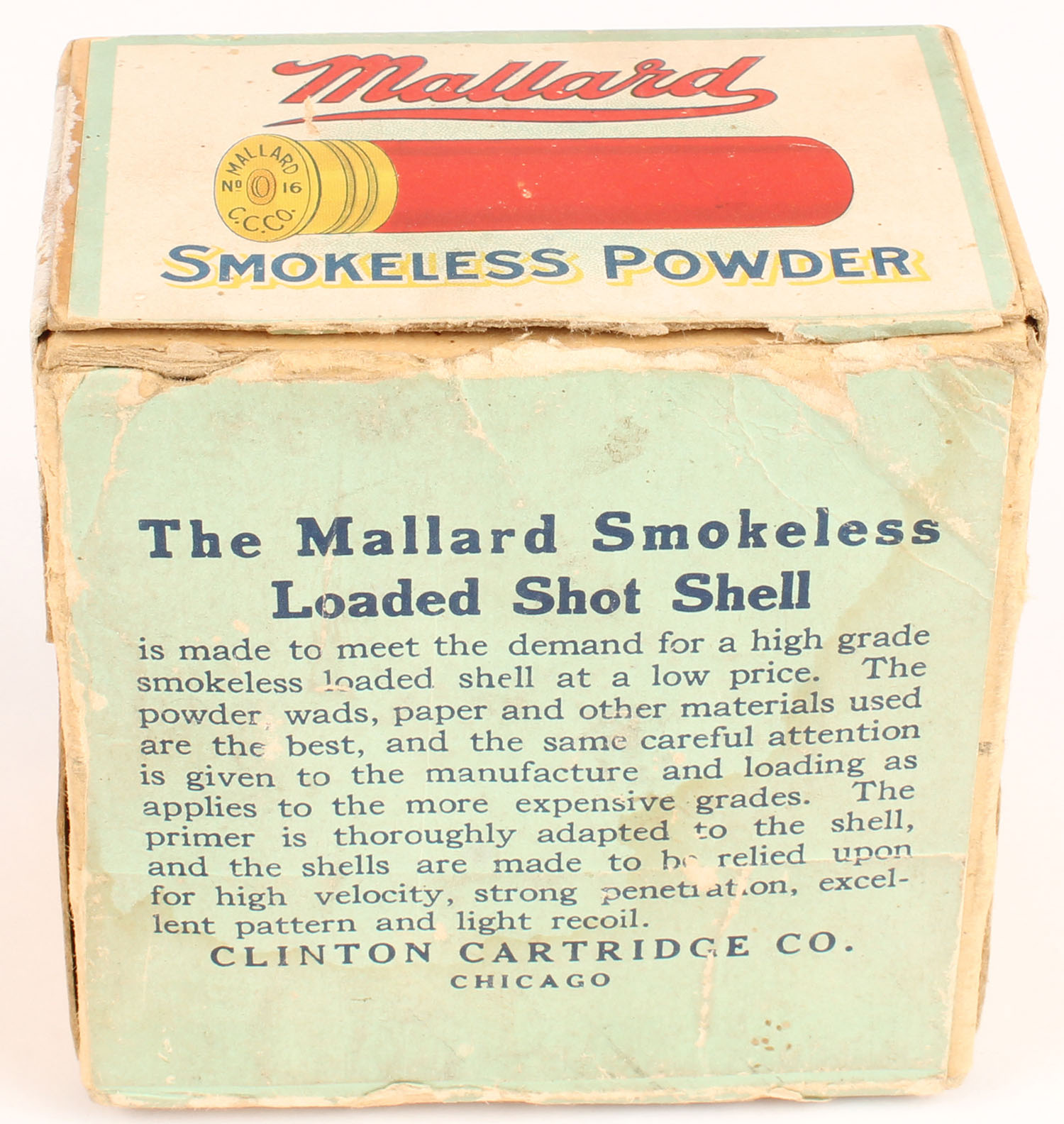 RARE! Clinton Cartridge Co., MALLARD, 16ga., 2pc., Partial 12rds fired paper shell, shot size 6 Shot, Loading 2 1/2 Drs. 1 oz. No. 6 Shot, buff box with multi colored label picturing a Mallard flying down, box has excellent colors with light age soiling & light scuffing, and seam split, label is 100% ORIGINAL, VERY RARE BOX! * Grade: Excellent + - Value: 1500 to 2500