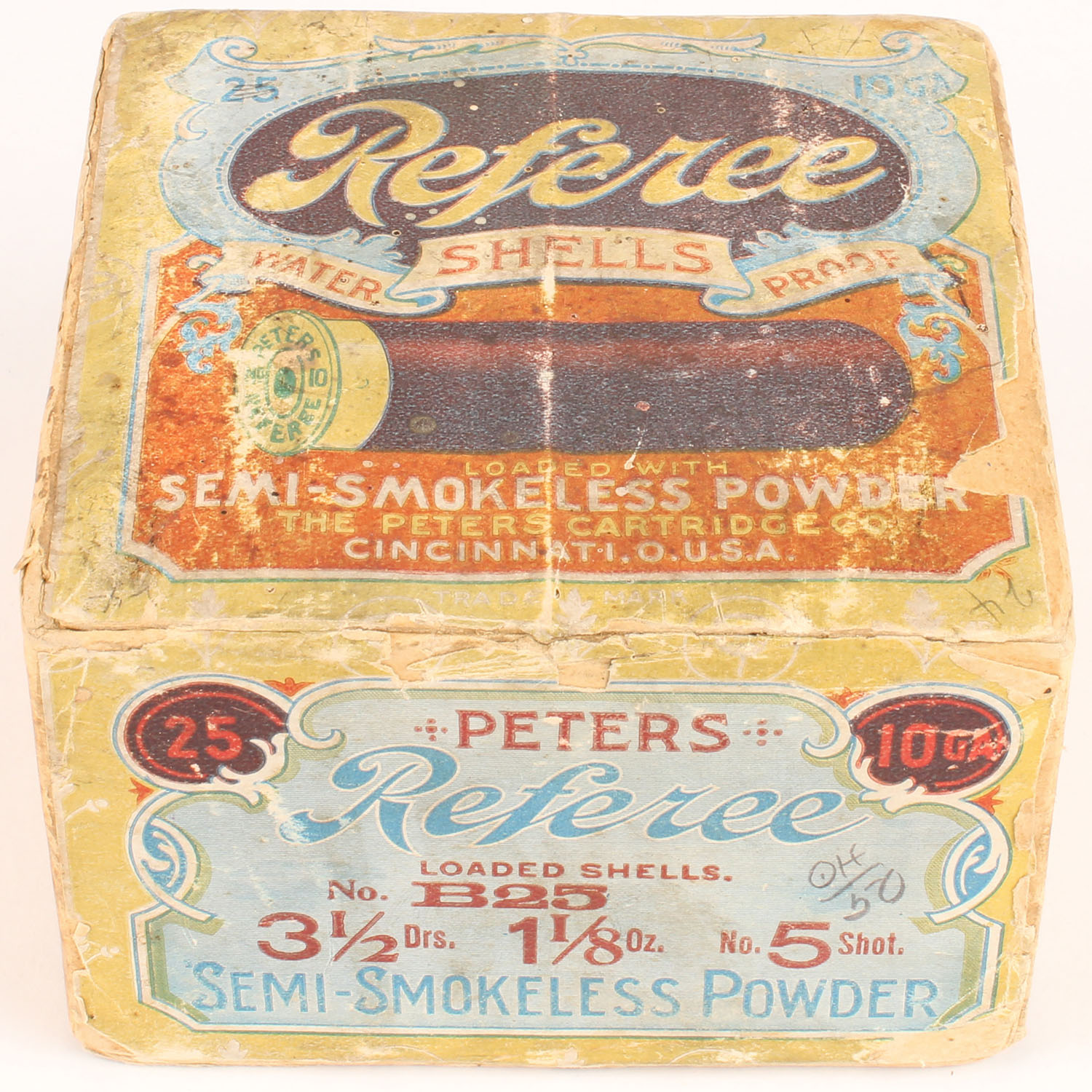 Peters Cart. Co., Referee without Mallard, 10ga., 2pc., Full of incorrect shot size, shot size 5, buff box with multi-colored label, Loading: No. B25, 3 1/2 Drs., 1 1/8 Oz. No. 5 Shot, Semi-Smokeless Powder, box has very nice label with bottom label being correct & being 95% intact but has soiling and light scuffing to label, box has tape repair, Shells are very good. Grade: Excellent + - Value: 600 to 1000