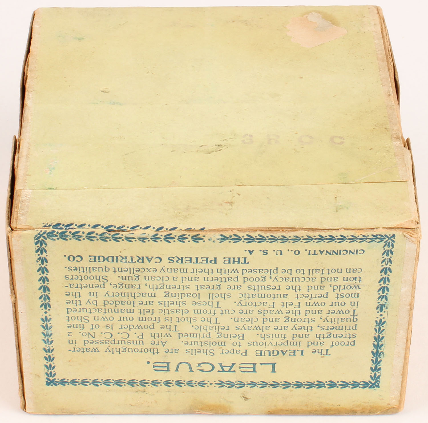 Peters Cart. Co., LEAGUE, 12 ga., 2pc., Empty, shot size 4, buff box with light Green, blue & yellow & four gold shotshell heads in each corner, Loading: No. 754, 3 1/4 Drs. 1 1/8 Oz. No. 4 Shot, box is very solid with light soiling and light scuffing, label is 100% intact. Grade: Excellent ++ - Value: 250 to 800