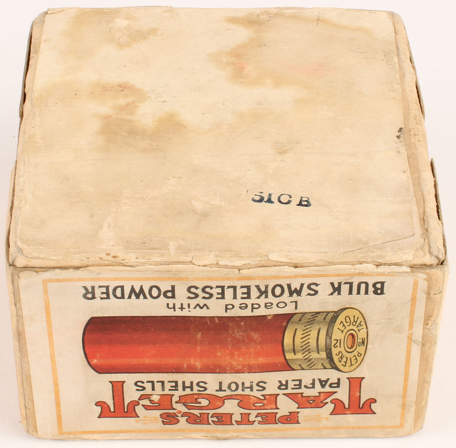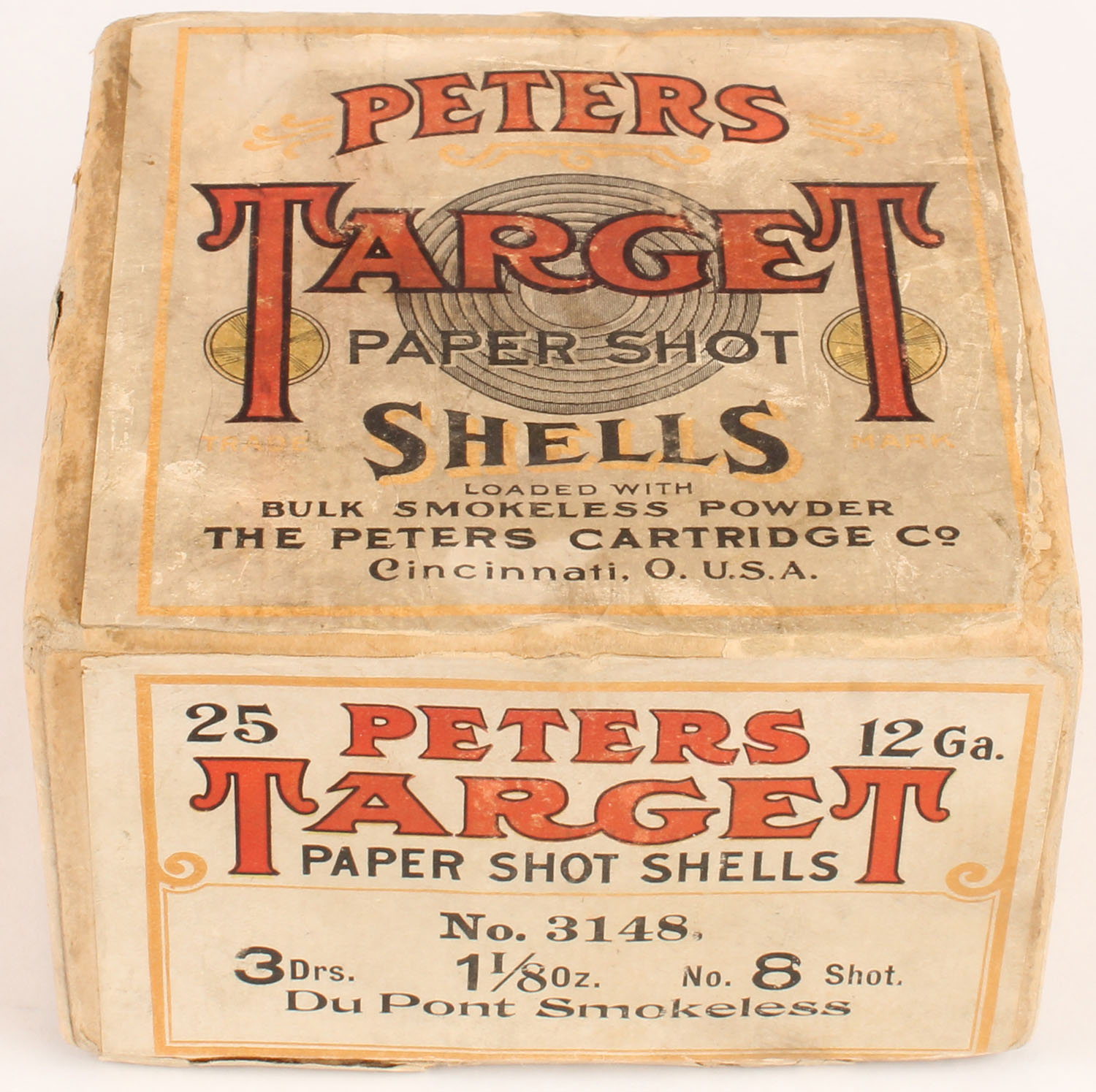 Peters Cart. Co. TARGET, 12ga, 2pc., Full, shot size 8, Dupont Smokeless, buff box with multi colored label that pictures clay bird, box is very solid with great label, has light age soiling and shell protrusion, Shells are excellent. HARD TO FIND BOX!* Grade: Excellent - Value: 500 to 1200