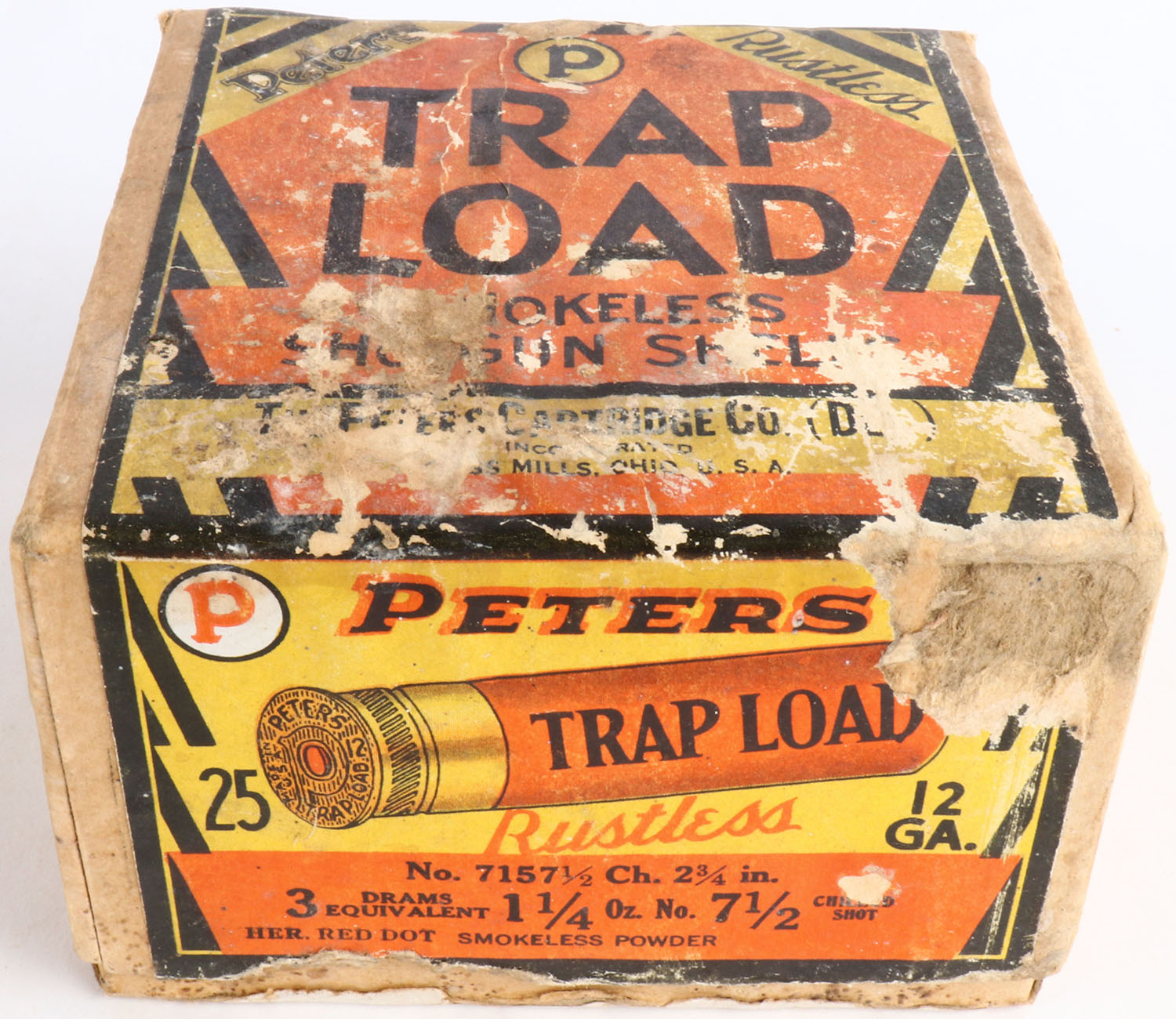 Peters Cart. Co., TRAP LOAD, 12ga., 2pc., Full of fired shotshells, ''HALLOWEEN BOX'' buff box with orange, yellow, white & black paper label, 7 1/2 Chilled Shot, 2 3/4'', box has soiling with major scuffing, edge wear & nice color to label, Shells are good. Grade: Very Good + - Value: 50 to 250