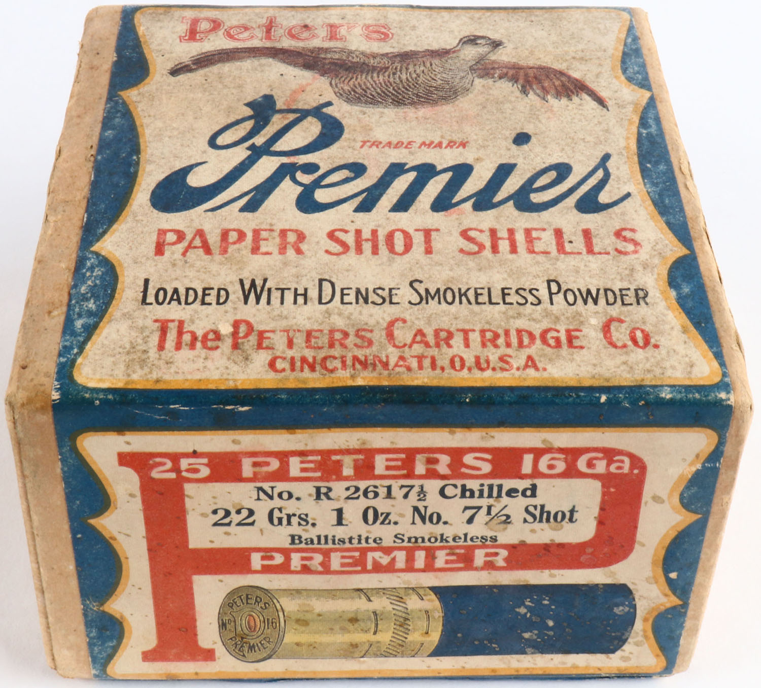 Peters Cart. Co. PREMIER, 16ga., 2pc., FULL & HALF SEALED, shot size 7 1/2, buff box with multi colored label that pictures a flying Prairie Chicken, box has edge wear & light shell protrusions with label being correct but having age soiling. Grade: Excellent - Value: 500 to 2000