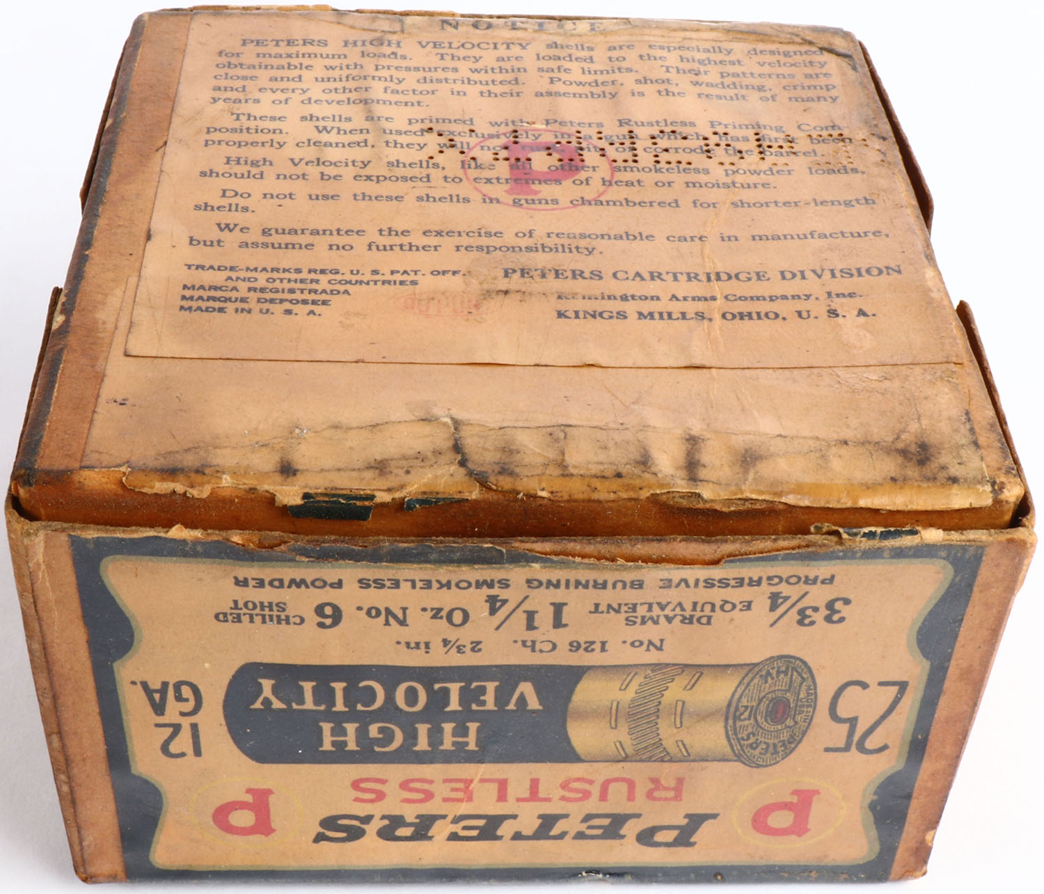 Peters Cart. Co., RED HEAD BOX, High Velocity, 12ga., 2pc., Empty, shot size 6 Chilled Shot, buff box with multi colored label that pictures RED HEAD in flight, 2 3/4'', Loading: NO 126 Ch. 3 3/4 drms. 1 1/4 oz. 6 Chilled Shot, box is solid, has age soiling and nice colored label. Grade: Good ++ - Value: 50 to 250