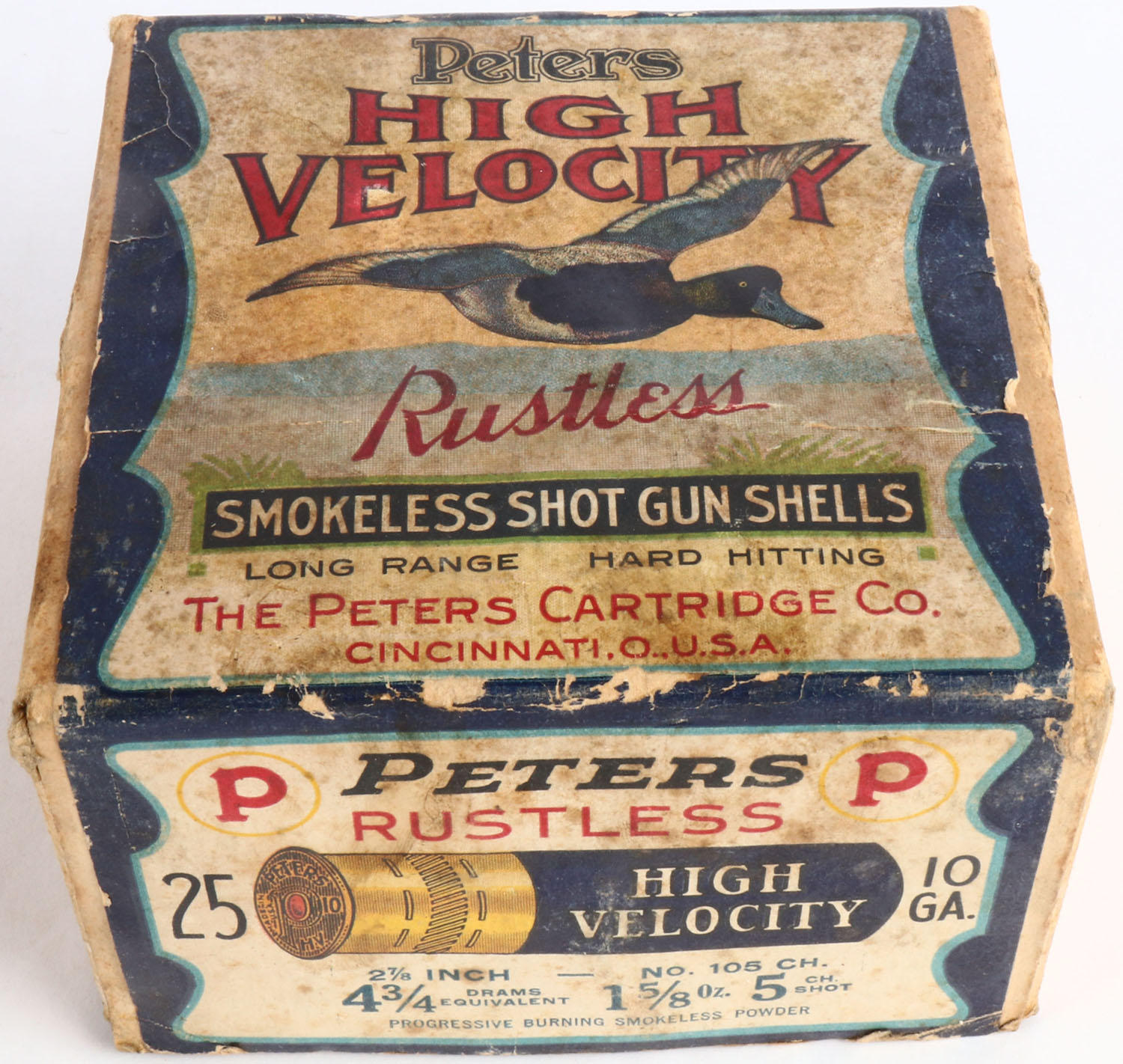 Peters Cart. Co., Blue Bill, 10Ga., 2pc., Empty, shot size 5 CH shot, buff box with multi colored label that pictures Blue Bill in flight, box has age soiling & light edge wear, box is solid with nice colors. Grade: Very Good + - Value: 100 to 300