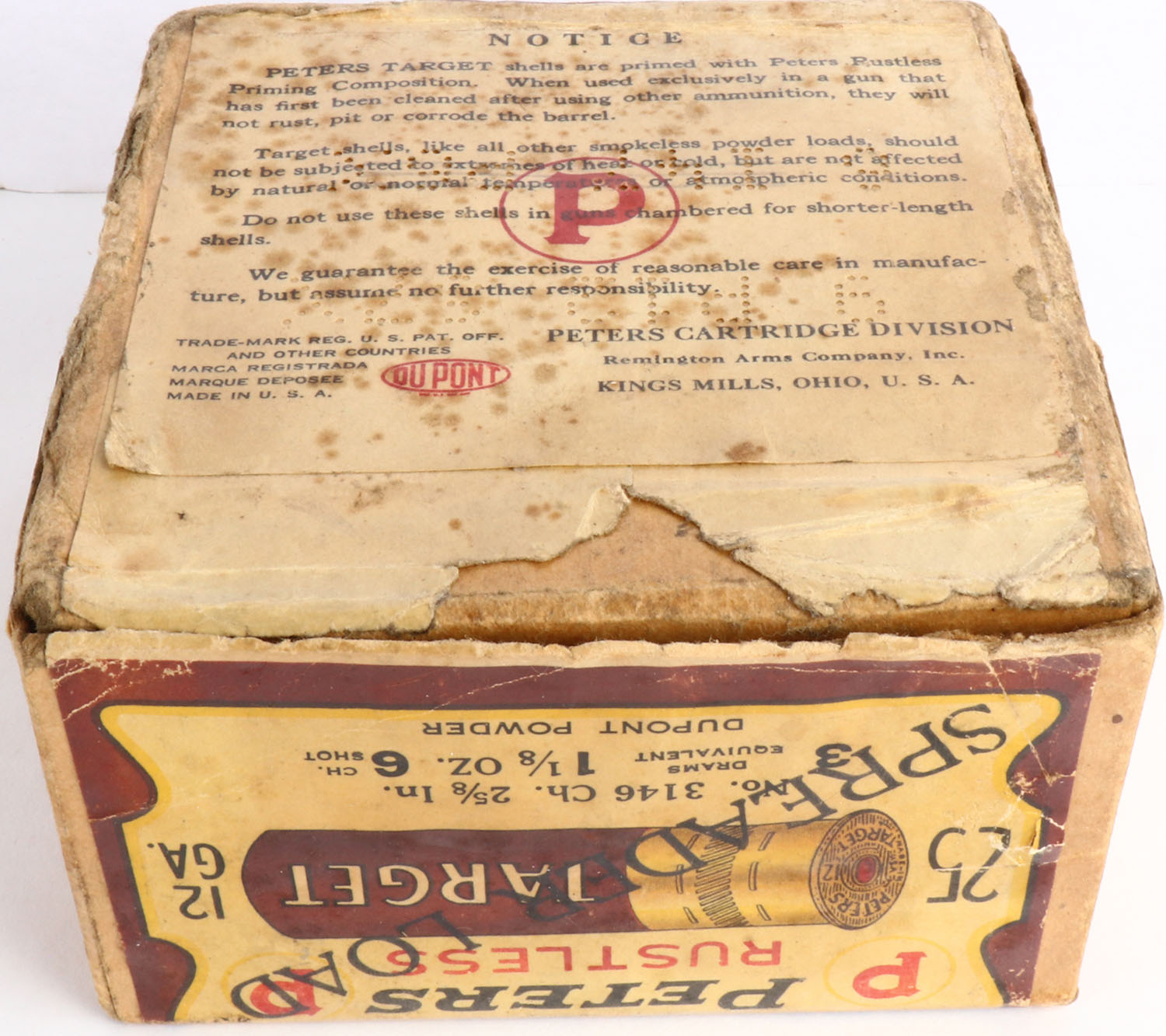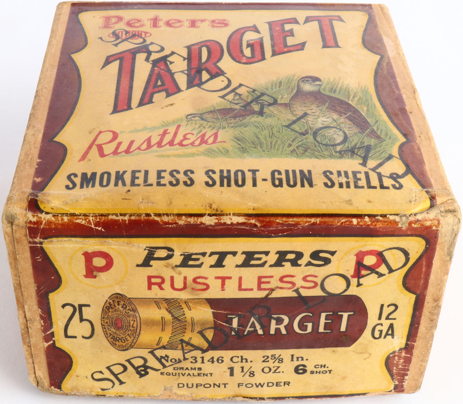 Peters Cart. Co., TARGET SPREADER LOAD, 12ga., 2pc., Empty, shot size 6 CH. Shot., buff box with multi-colored label with Covey of Quail in the grass, box is solid & label shows age soiling, box has edge wear & light scuffing, King Mills, OH. USA. Grade: Very Good + - Value: 100 to 300