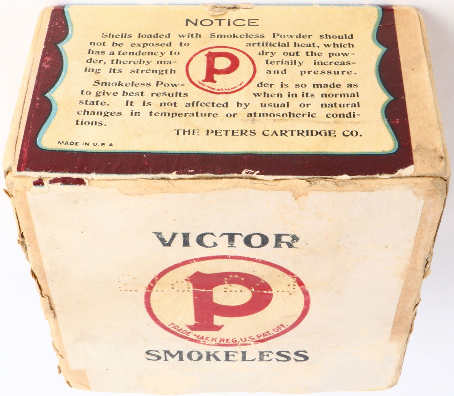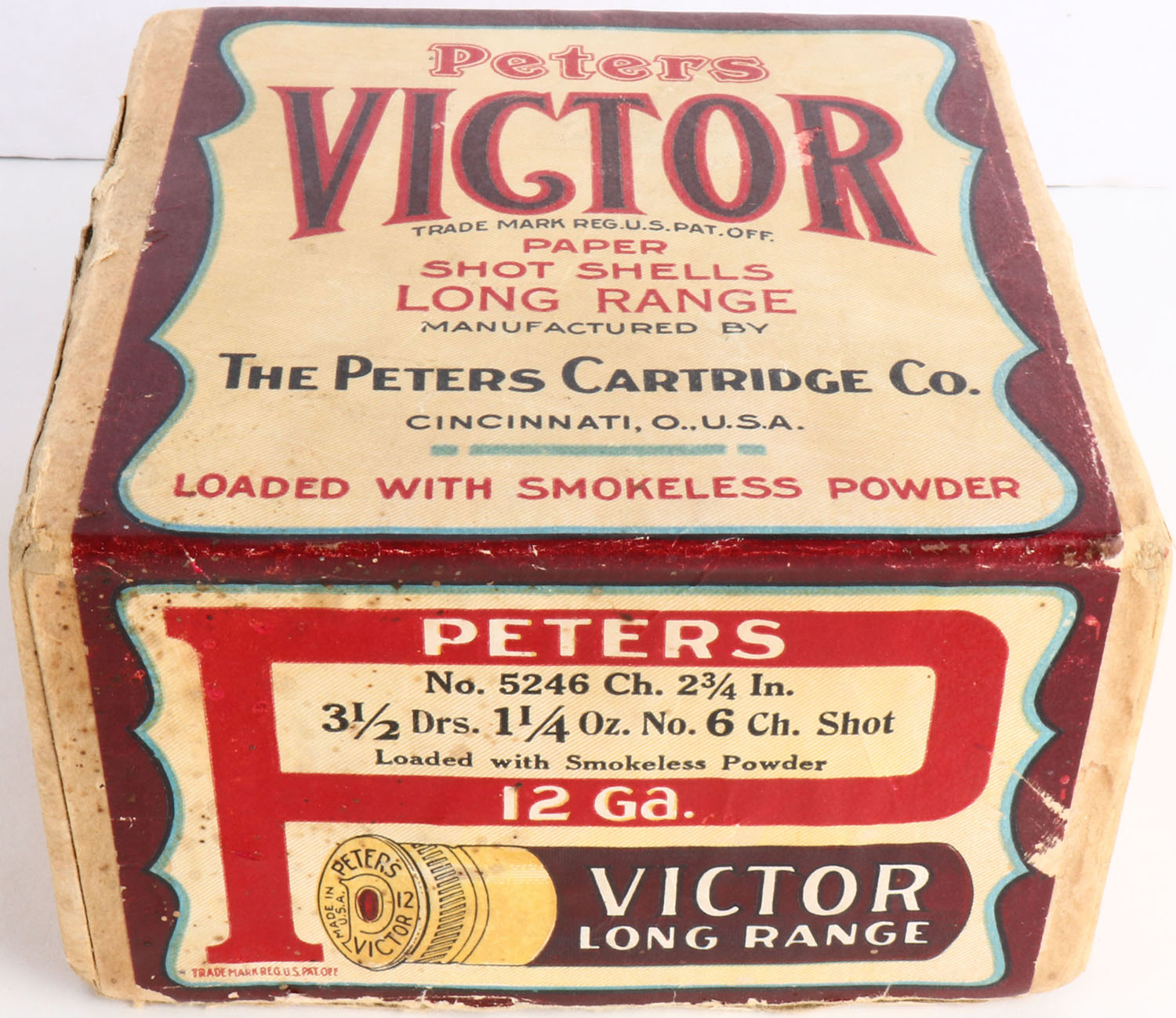 Peters Cart. Co., Victor, Rustless, 12ga., 2 3/4'', 2pc., Full, shot size 6 Ch, buff box with brown, cream & black label, box is solid with seam splits & light soiling, box has very nice label, Shells are excellent. Grade: Excellent - Value: 50 to 250