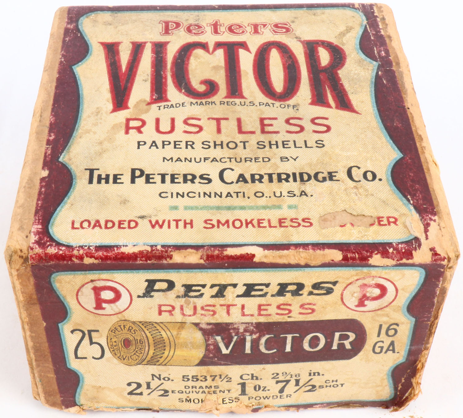 Peters Cart. Co., Victor, Rustless, 16ga., 2 9/16'', 2pc., Empty, shot size 7 1/2 CH, buff box with brown, cream & black label, box is solid with age soiling, edge wear & light scuffing, box has good label & colors are nice. Grade: Very Good ++ - Value: 40 to 250