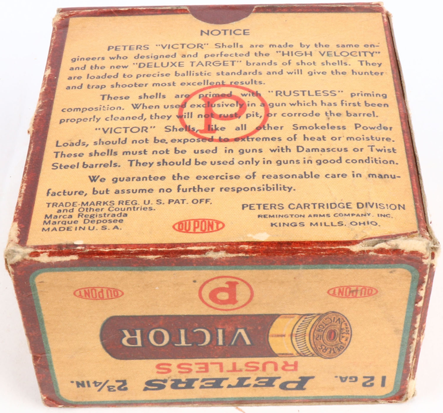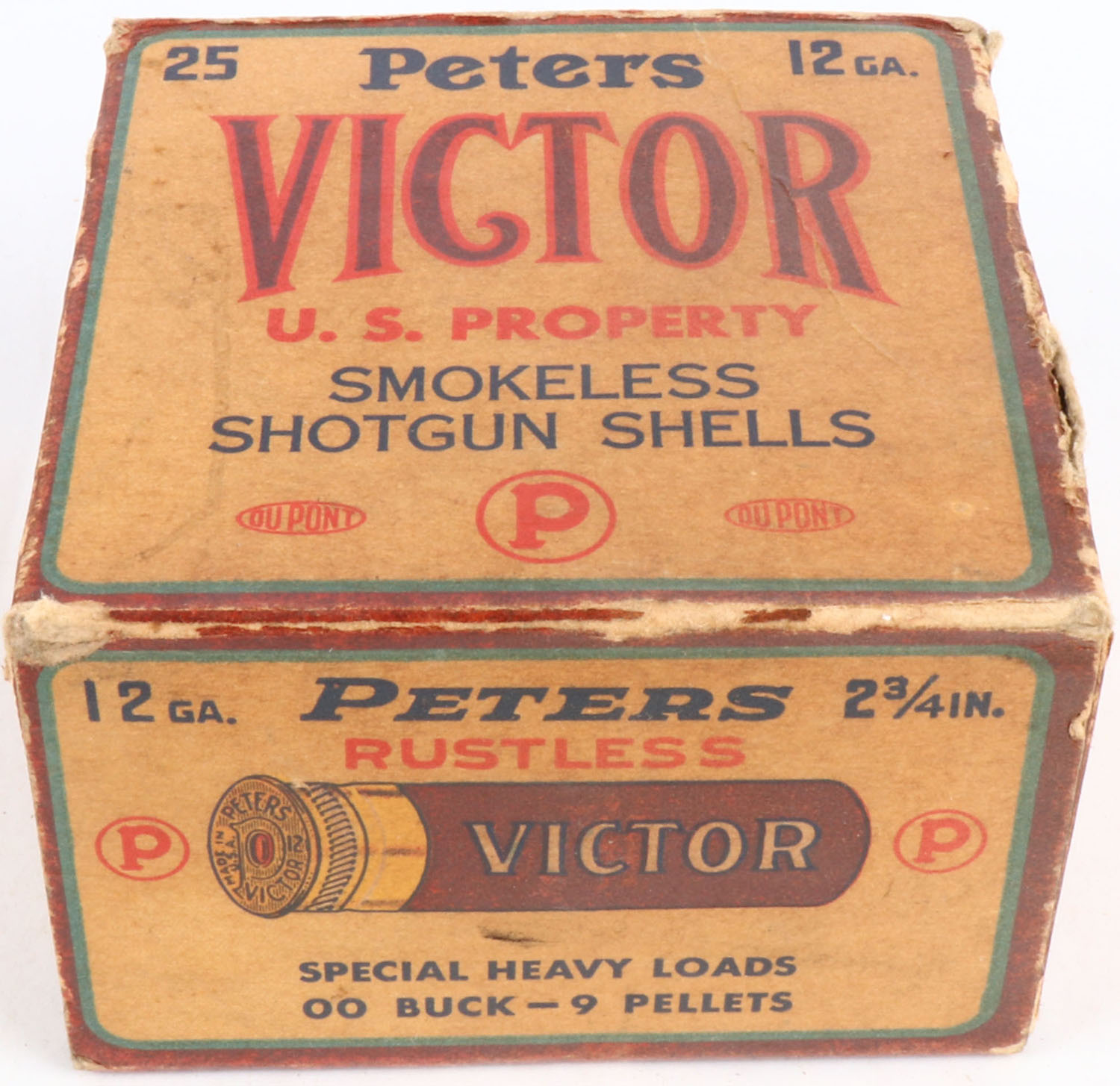Peters, Victor, U.S. Property 12ga, 1pc., Partial 17rds, shot size 00 Buck, Maroon, cream & orange box, 2 3/4'', box has edge wear, shell protrusion & light soiling with very nice colors, Shells are excellent. Grade: Excellent - Value: 30 to 60