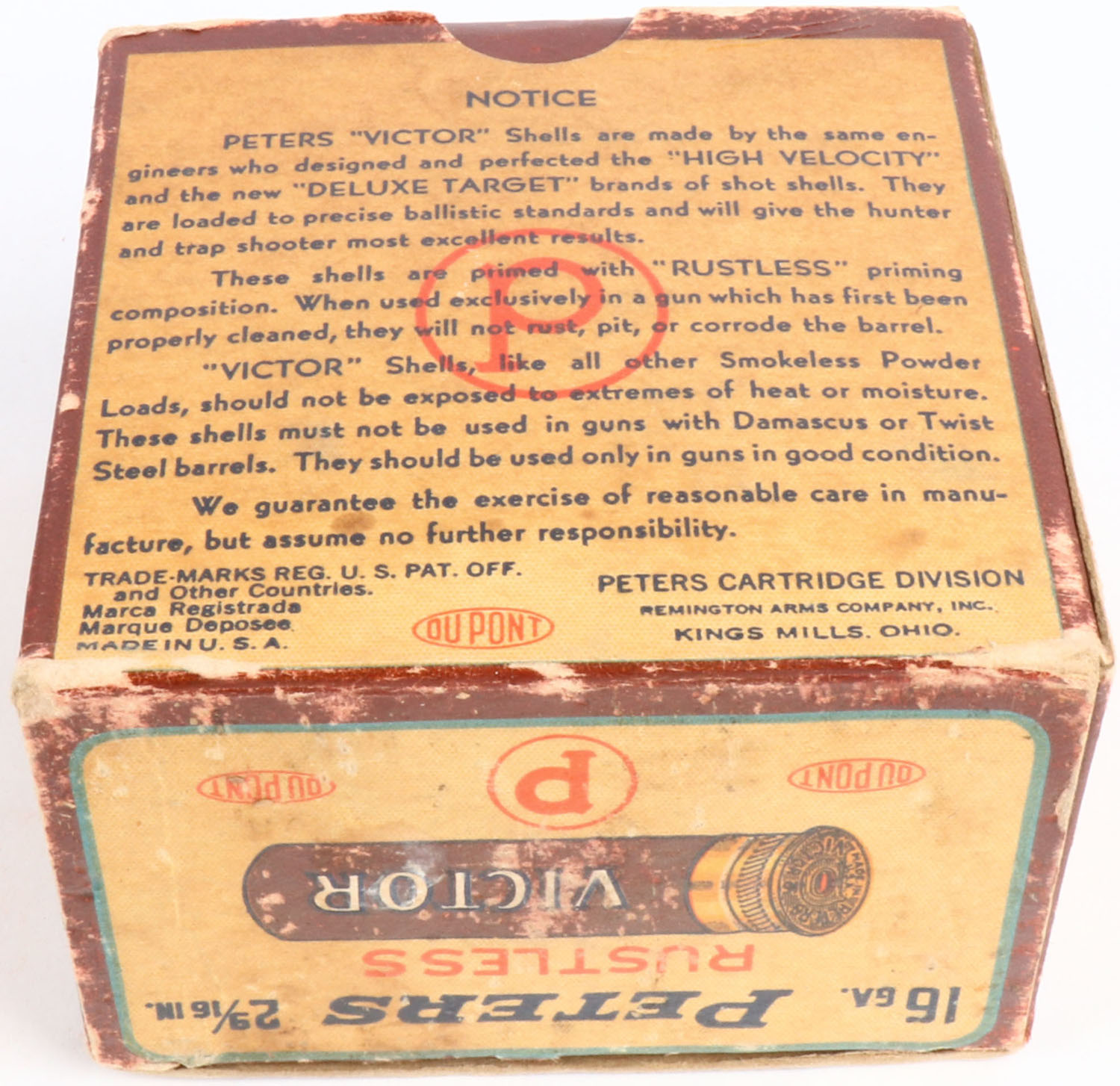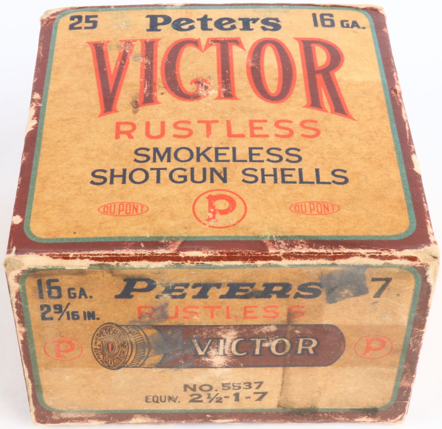 Peters, Victor, 12ga, 1pc., Empty, shot size 7, Maroon, cream & orange box, 2 9/16'', box has edge wear, scuffing & light soiling with tape repairs. Grade: Very Good + - Value: 10 to 30