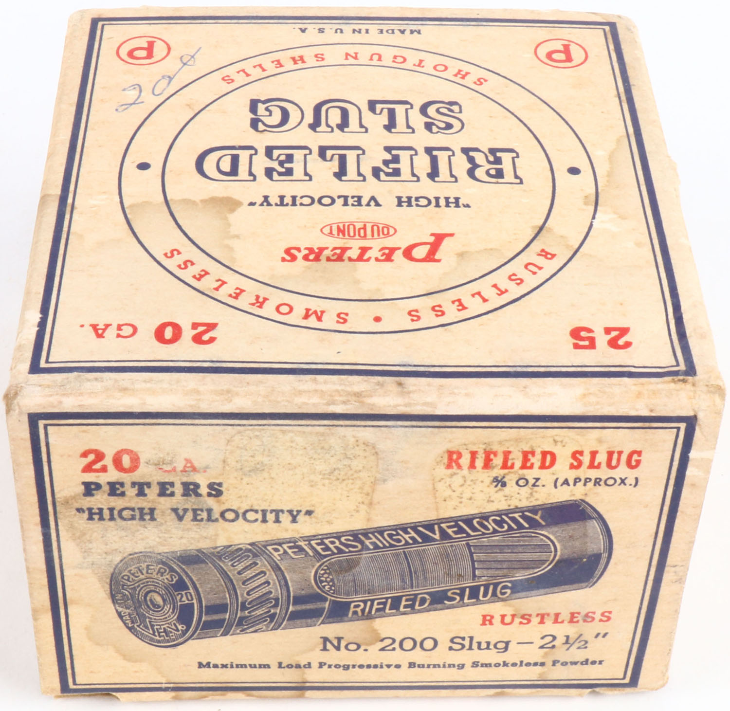 Peters Cart. Co., RIFLED SLUGS, 20 GAUGE, 2 3/4'', 1pc., Partial 9rds with 5rds being correct gauge, shot size Rifled Slug, multi colored box, box is very solid with great colors, box has soiling, Shells are excellent. Grade: Excellent - Value: 20 to 60