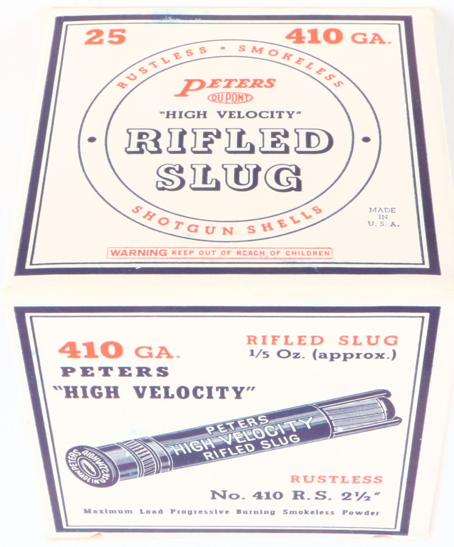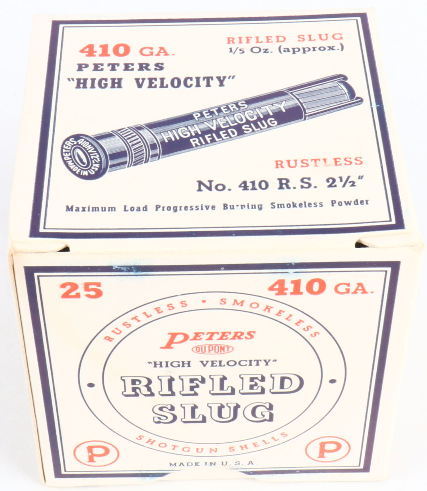 Peters Cart. Co., RIFLED SLUGS, 410 GAUGE, 2 1/2'', 1pc., Full, shot size Rifled Slug, multi colored box, box is very solid with MINT colors, shells are excellent. Grade: MINT - Value: 40 to 120