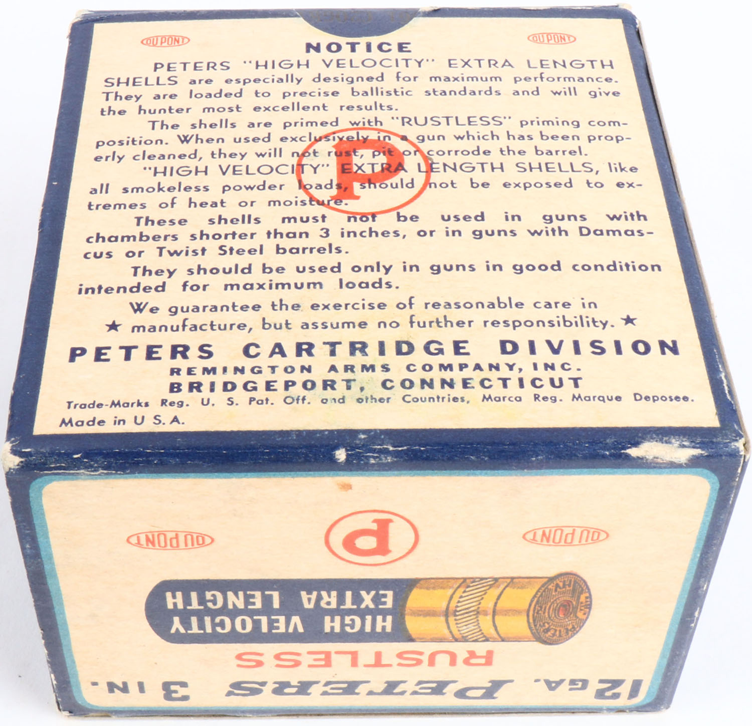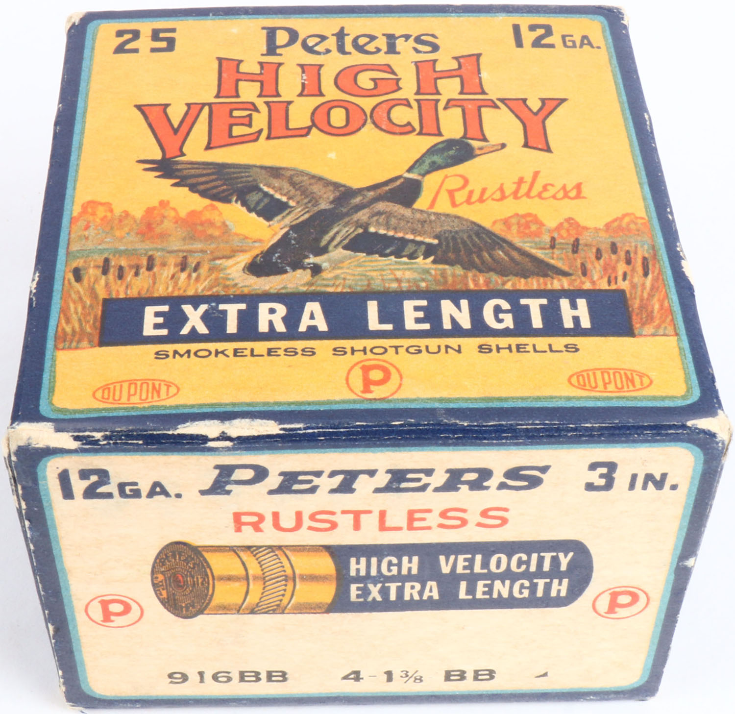 Peters Cart. Co., Bridgeport, CT, EXTRA LENGTH, High Velocity, 12ga., 3'', 1pc., Full, shot size BB, multi colored box that pictures mallard flying out of the marsh grass, box is very solid with light edge wear & great colors, shells are excellent. Grade: Excellent ++ - Value: 40 to 100