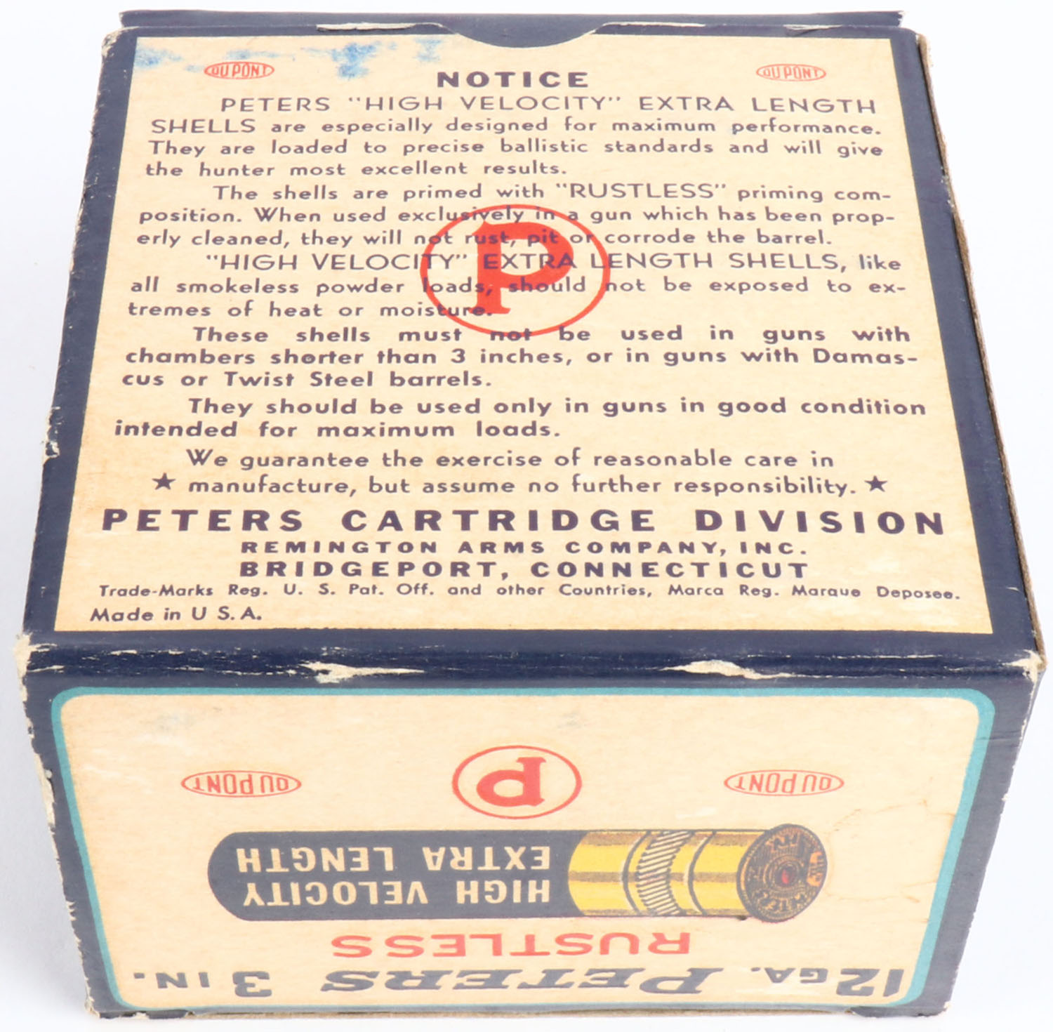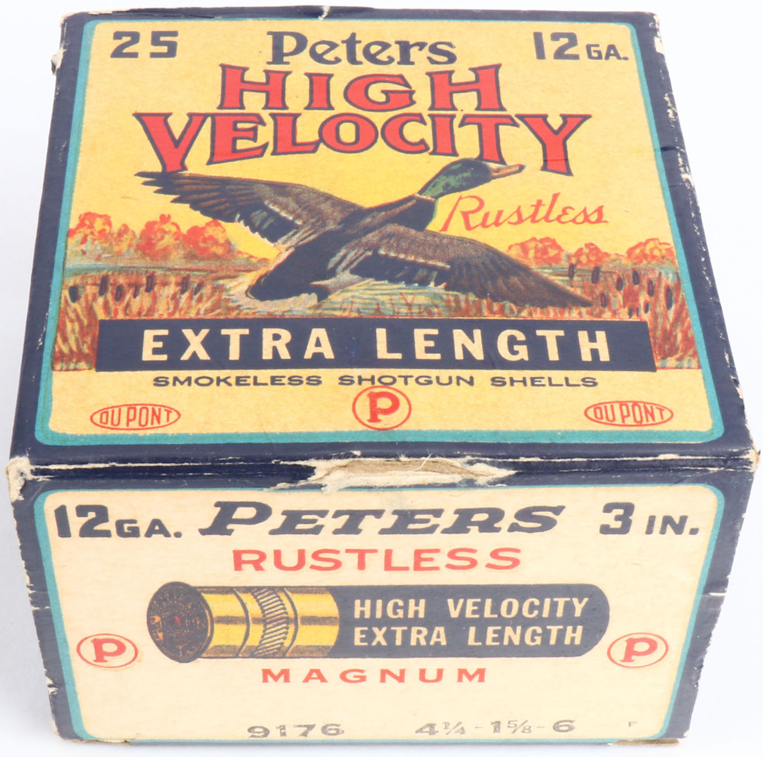 Peters Cart. Co., Bridgeport, CT, EXTRA LENGTH, High Velocity, 12ga., 3'', 1pc., Partial 19rds with all being incorrect shot size, shot size 6 Magnum, multi colored box that pictures mallard flying out of the marsh grass, box is very solid with light edge wear & great colors, shells are excellent. Grade: Excellent + - Value: 40 to 100